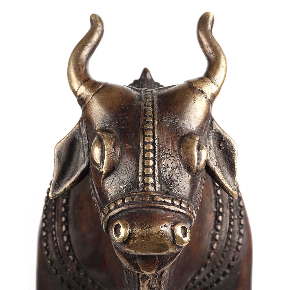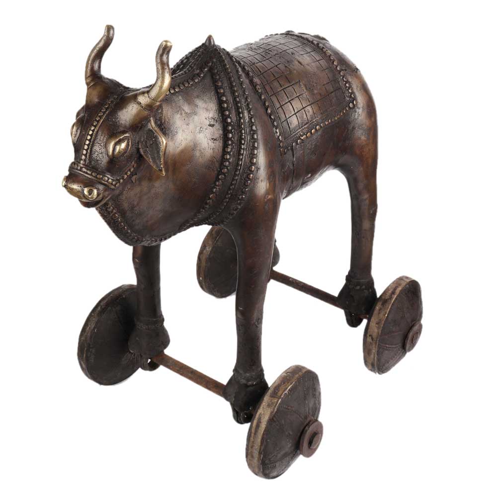 Brass Ox Statue On wheel old traditional toy made by the local craftsmen of India. Home decoration, shop decoration, garden decoration, display stand use, wedding gift, anniversary gift for near and dear ones.