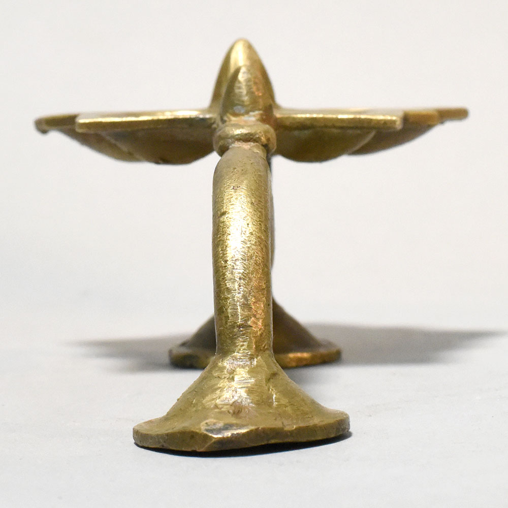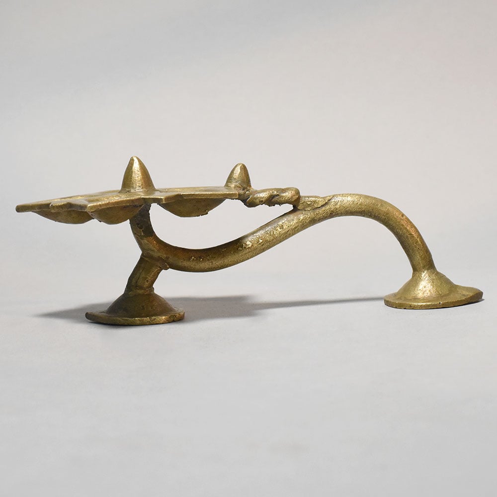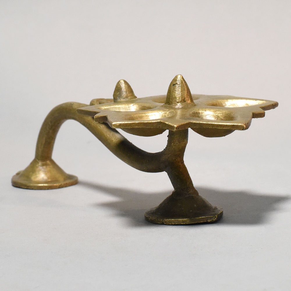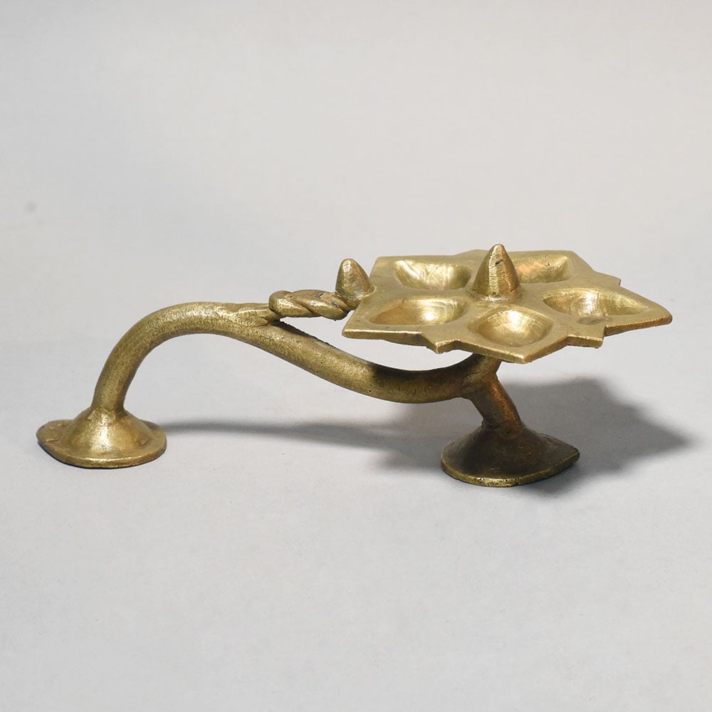 This brass Panchmukhi aarti diya lamp with handle is a traditional devotional lamp used in Hindu pooja rituals and temple ceremonies. The lamp features a five-wick design arranged in a floral or star-shaped plate, allowing multiple cotton wicks to be lit simultaneously during aarti and religious offerings. In Hindu tradition, the Panchmukhi diya represents the five sacred elements of nature earth, water, fire, air, and space. Lighting a five-flame lamp symbolizes offering light, energy, and devotion to the divine. Panchmukhi lamps are widely used during daily prayers, temple rituals, and special festivals such as Diwali, Navratri, and other auspicious occasions. The diya includes five small oil cavities designed to hold ghee or oil along with cotton wicks. Raised wick holders at the center help keep the wicks stable while burning. The lamp is supported by a sturdy pedestal base that provides stability when placed on a pooja altar or temple platform. A gracefully curved handle extends from the base, making it easy to hold the lamp during aarti rituals, where the diya is traditionally rotated in circular motions in front of the deity. Crafted from solid brass, the lamp has a warm golden tone that highlights its traditional metal craftsmanship. Over time, the brass develops a natural patina that enhances its vintage devotional appearance. Perfect for home temples, pooja rooms, festive rituals, and spiritual ceremonies, this Panchmukhi aarti lamp is both a practical ritual tool and a meaningful spiritual artifact.