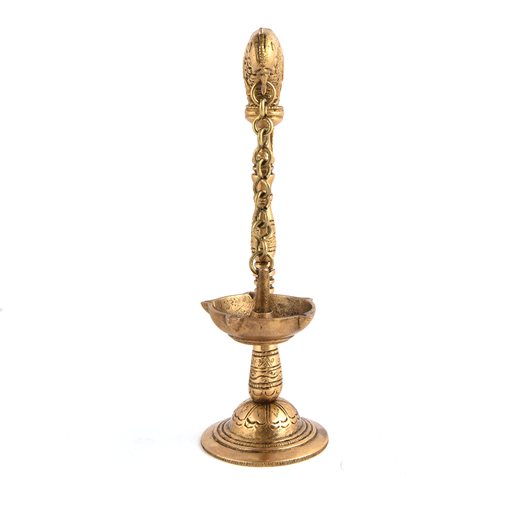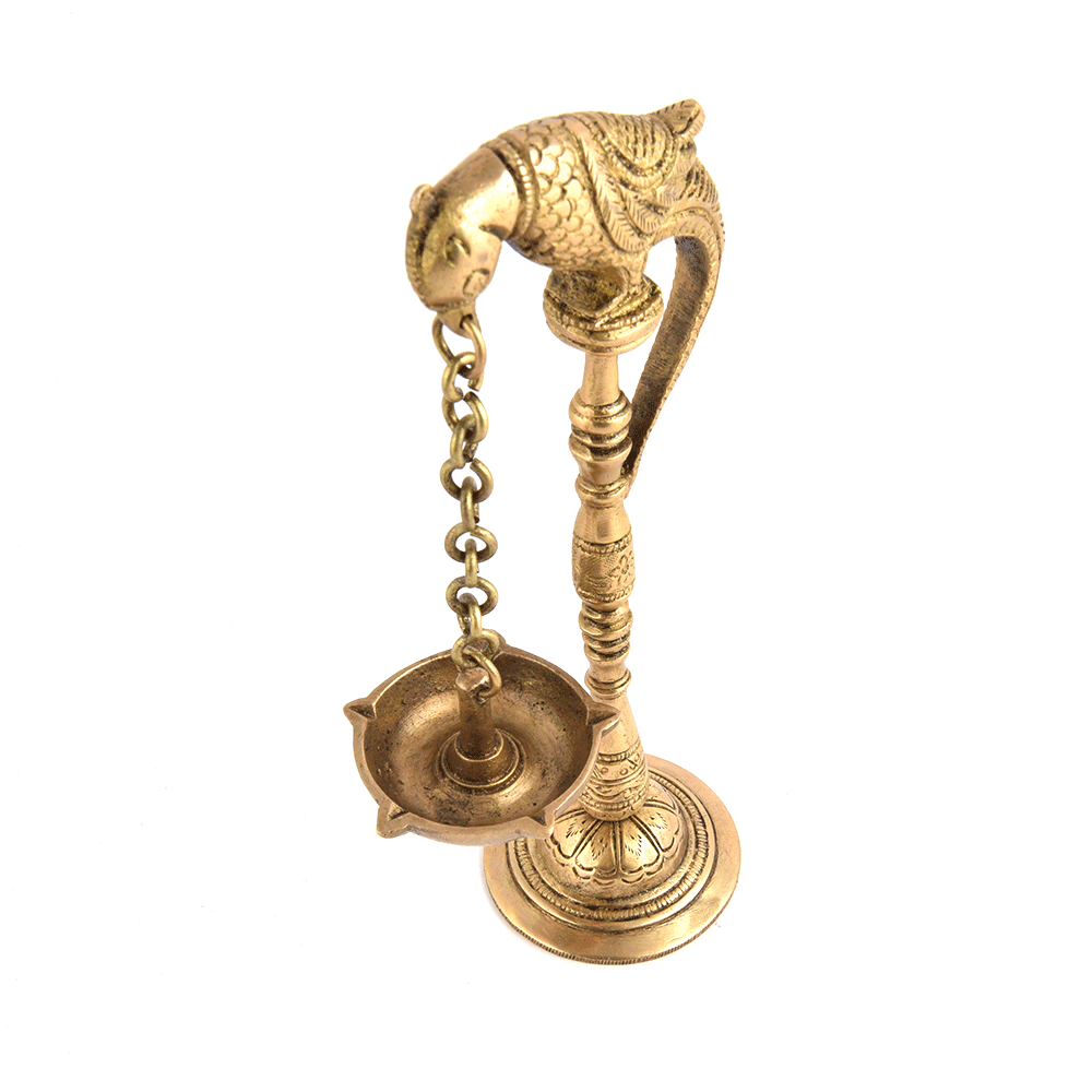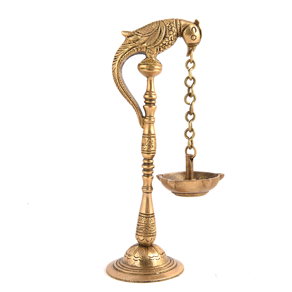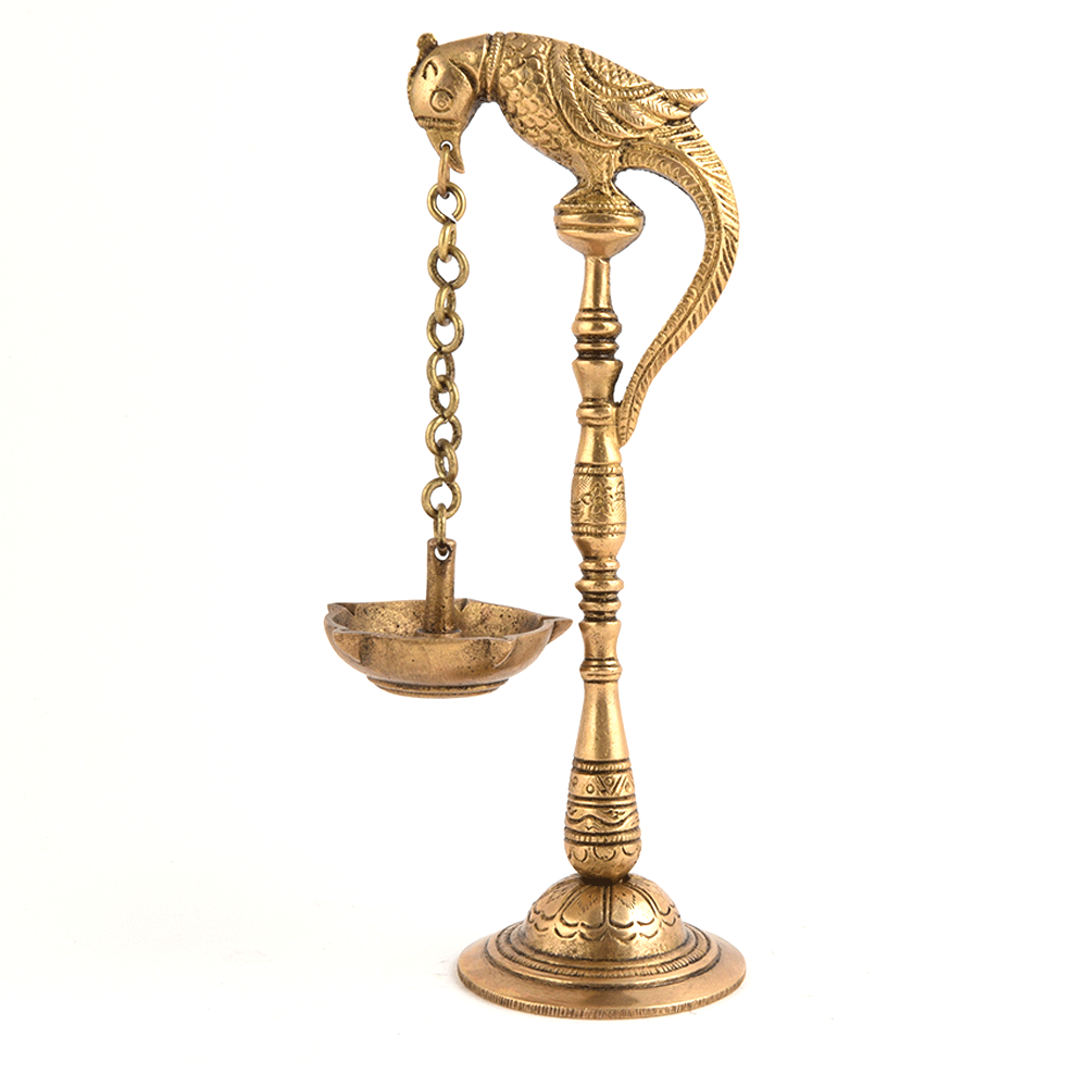 Parrot Hanging Lamp has a 5 Spout Oil Holder with Coils That Hangs From the Mouth of a Parrot Which is Attached to a Base That Rests on the Ground. All These Lamps are a Perfect and a Completely Inevitable Part of Any Religious or Cultural Gathering. Decorate Your Homes, Offices, Temples, Etc. with These Hanging Lamps and Spread Positivity in All Directions.