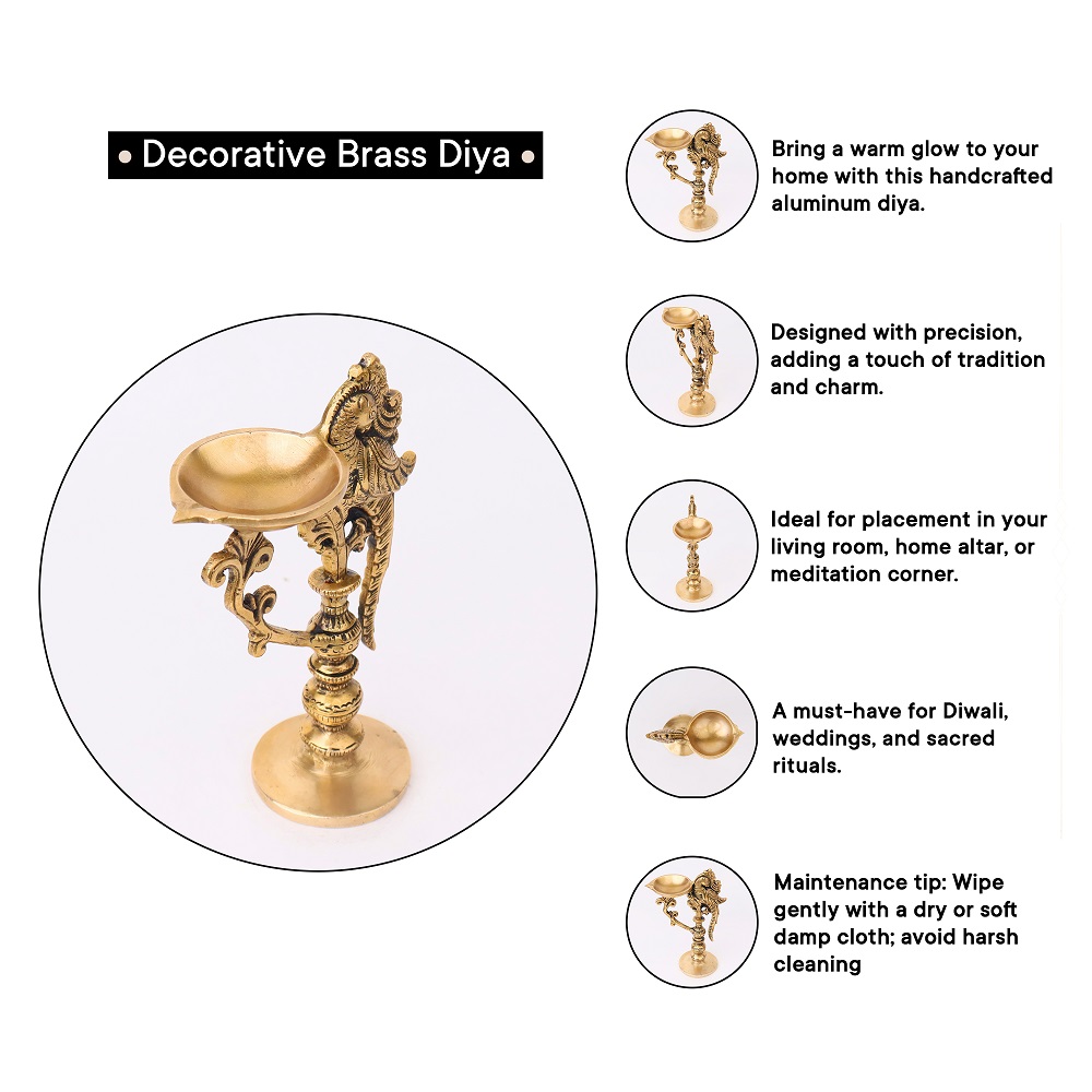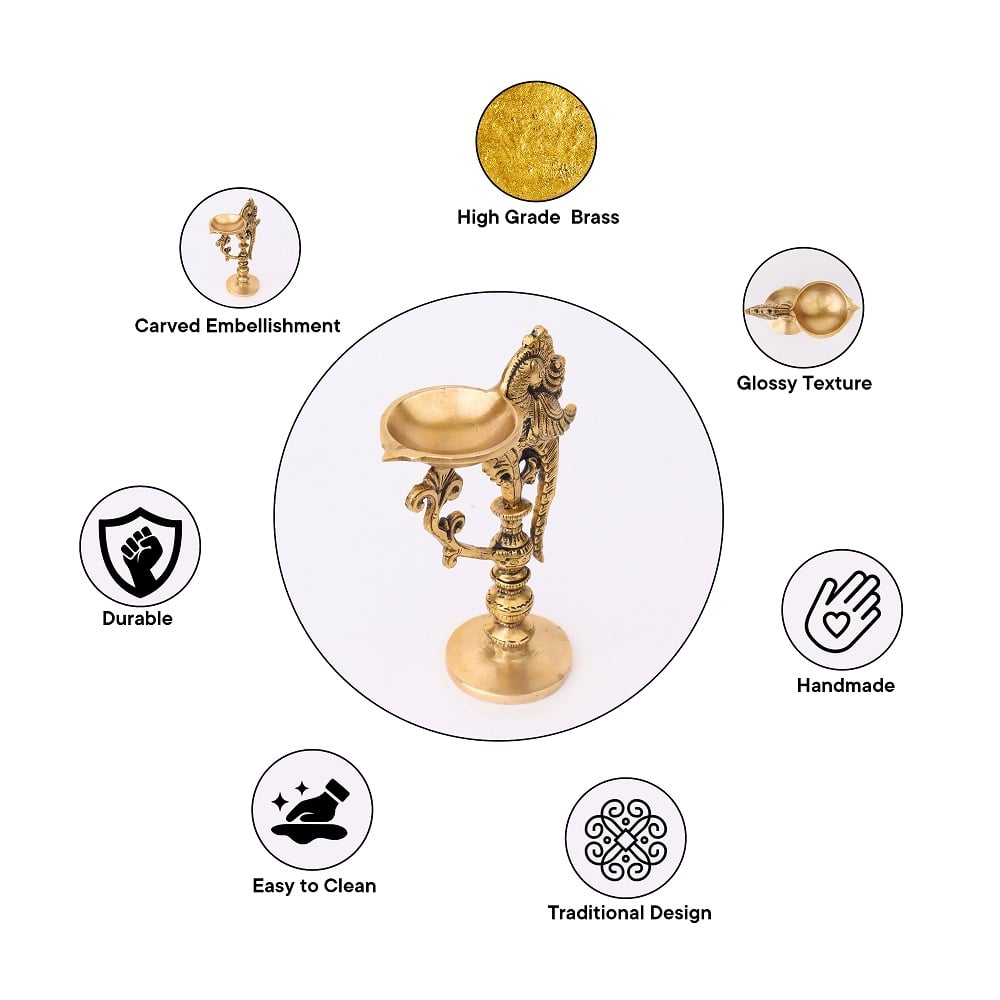 Peacock brass handle Diya is a one-of-a-kind work of art handcrafted with a traditional touch and intricate designs. This brass Diya features a hollow base, a vertical stand with simple and elegant carvings, and a handle to hold over a Peacock design. This brass Diya features an adorable Peacock carved with lovely designs and a single wick diya with a broad base with more oil holding capacity. This brass Diya will be the best home decor that adorns and adds beauty wherever it is kept. This brass diya can be used as decoration on any festive or special occasion.