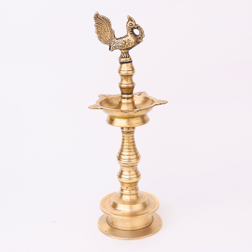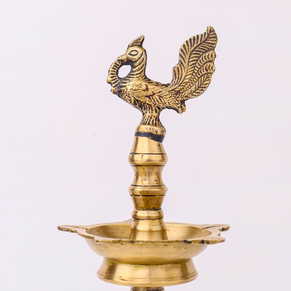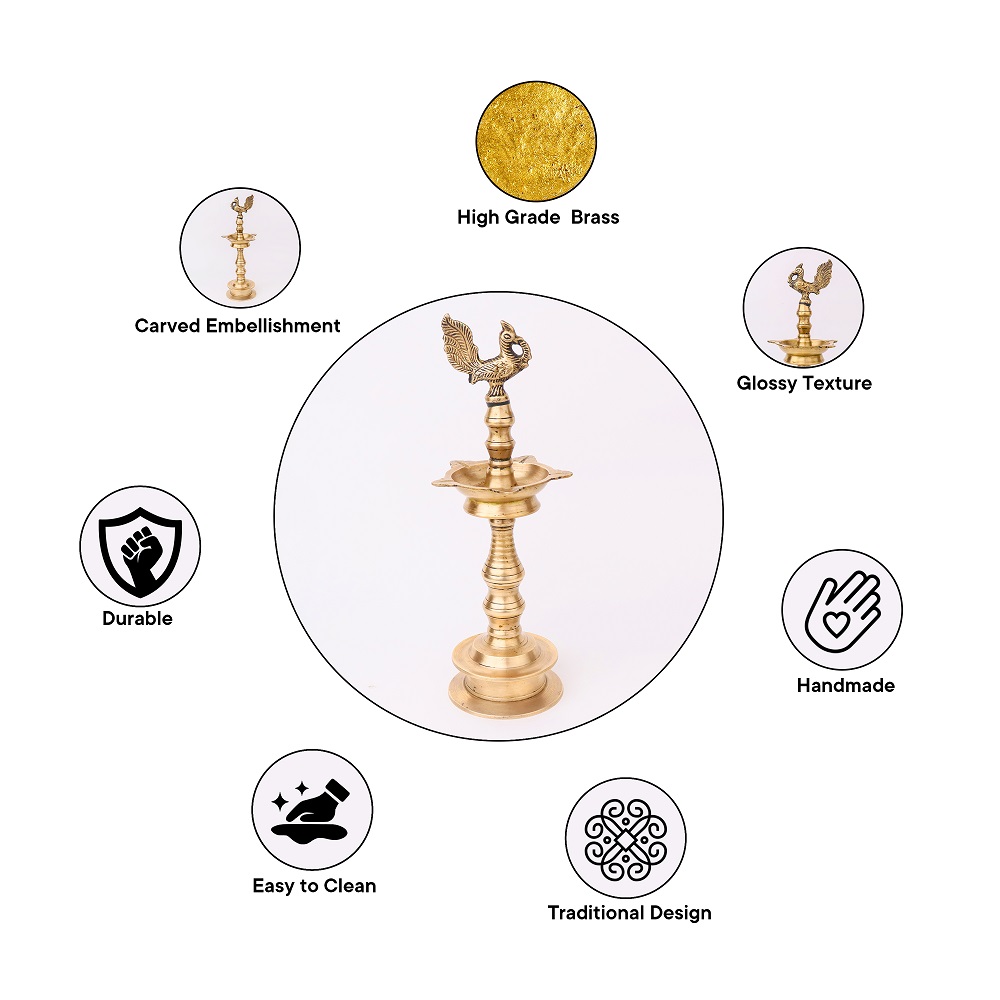 The South Indian brass oil lamp is a true work of art, featuring a stunning peacock carving on the top. This elegant lamp boasts five jyots that can be lit using either mustard oil or desi ghee and cotton wicks, making it a versatile addition to any temple or home decor. Crafted using traditional South Indian art techniques, this lamp is sure to impress with its intricate detailing and bold golden colour. It's a popular item for collectors and is ideal for creating a cosy ambiance or for special occasions. This brass oil lamp is a must-have for anyone looking to add a touch of South Indian art and culture to their home or temple. An amazing gift for every special or festive occasions to your loved ones.