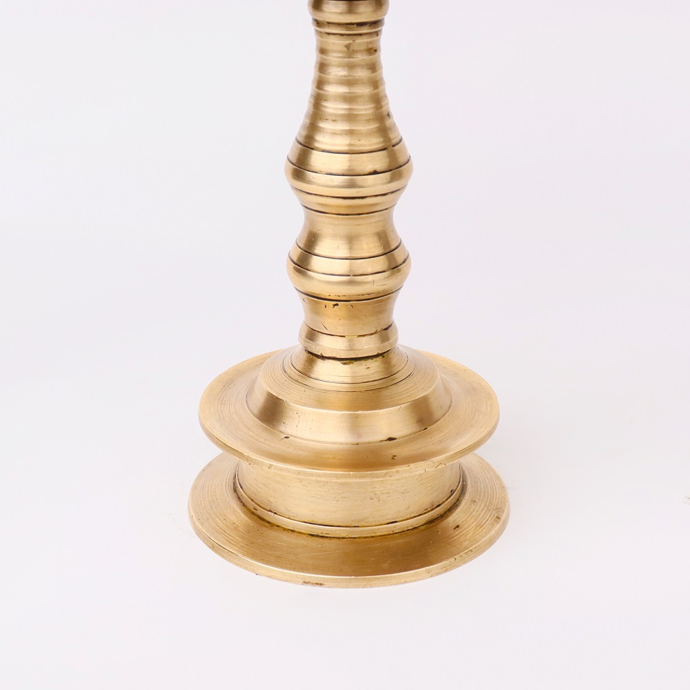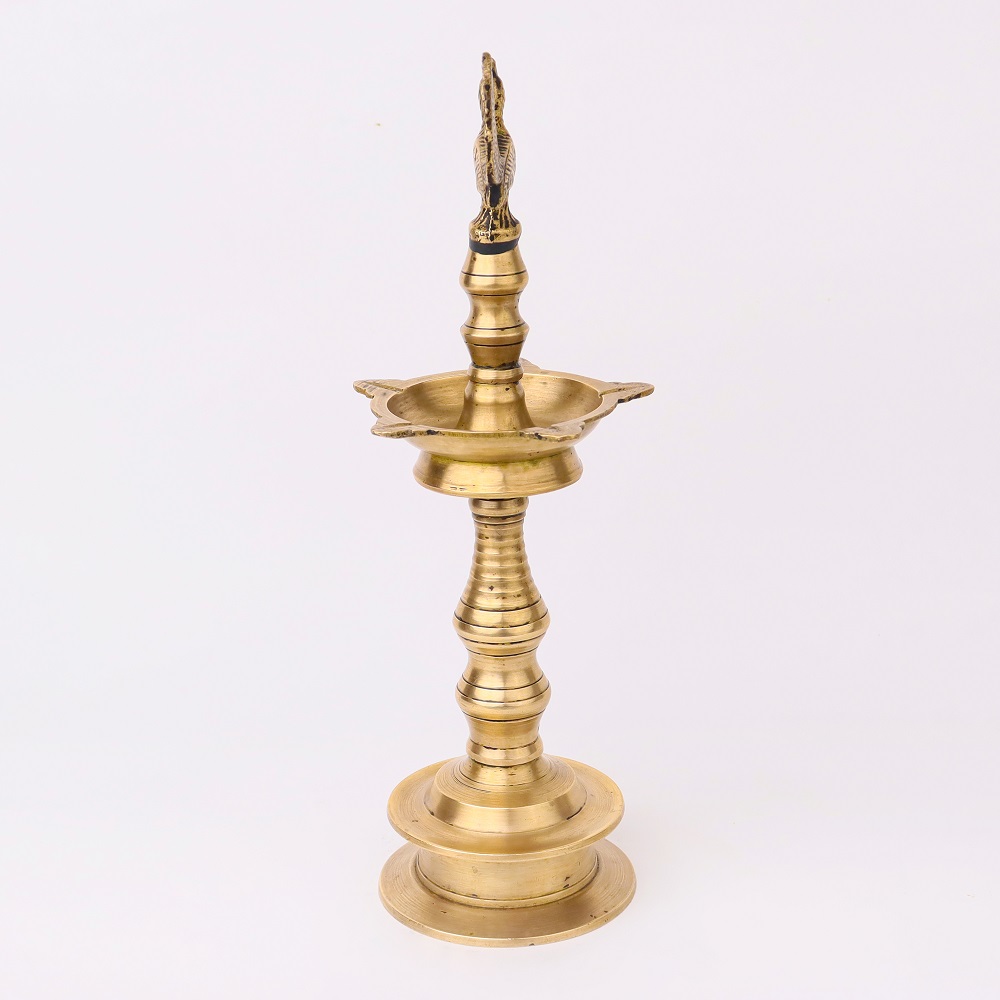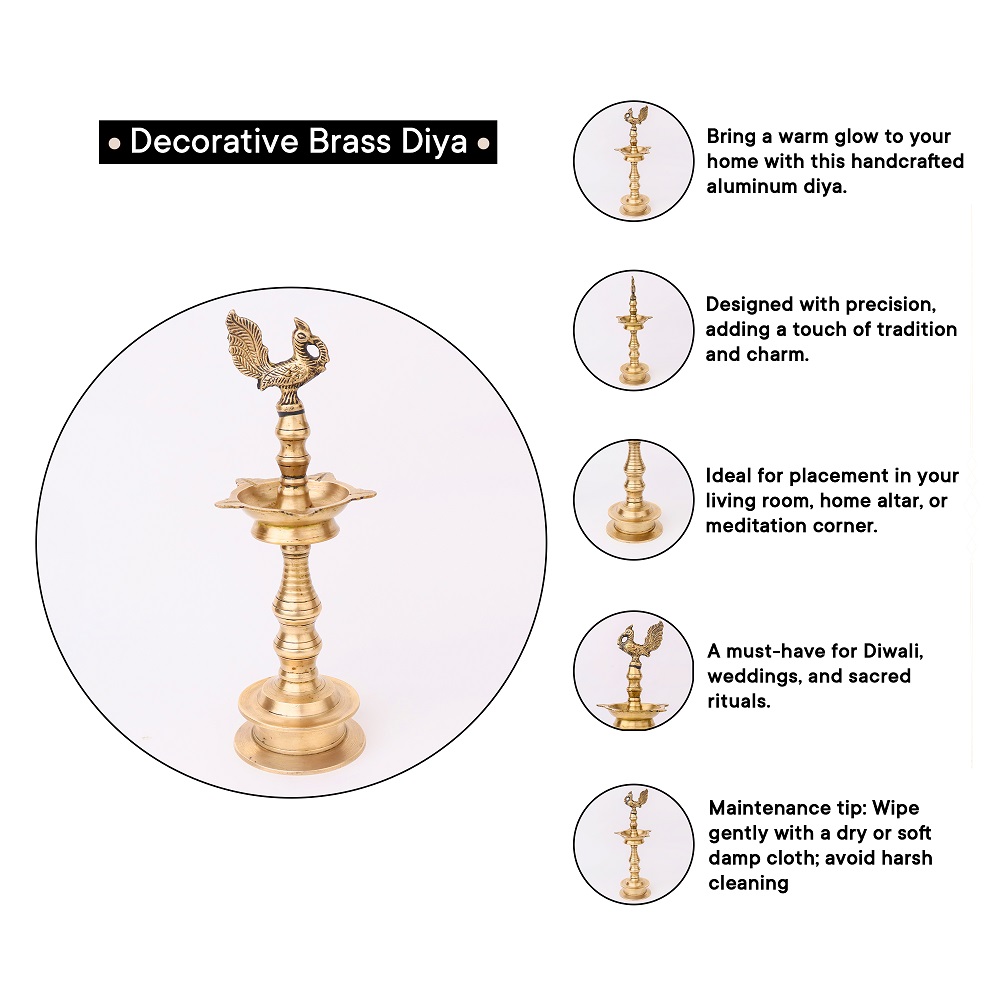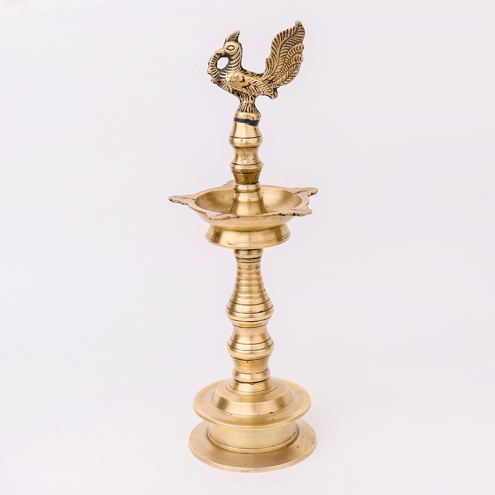 The South Indian brass oil lamp is a true work of art, featuring a stunning peacock carving on the top. This elegant lamp boasts five jyots that can be lit using either mustard oil or desi ghee and cotton wicks, making it a versatile addition to any temple or home decor. Crafted using traditional South Indian art techniques, this lamp is sure to impress with its intricate detailing and bold golden colour. It's a popular item for collectors and is ideal for creating a cosy ambiance or for special occasions. This brass oil lamp is a must-have for anyone looking to add a touch of South Indian art and culture to their home or temple. An amazing gift for every special or festive occasions to your loved ones.