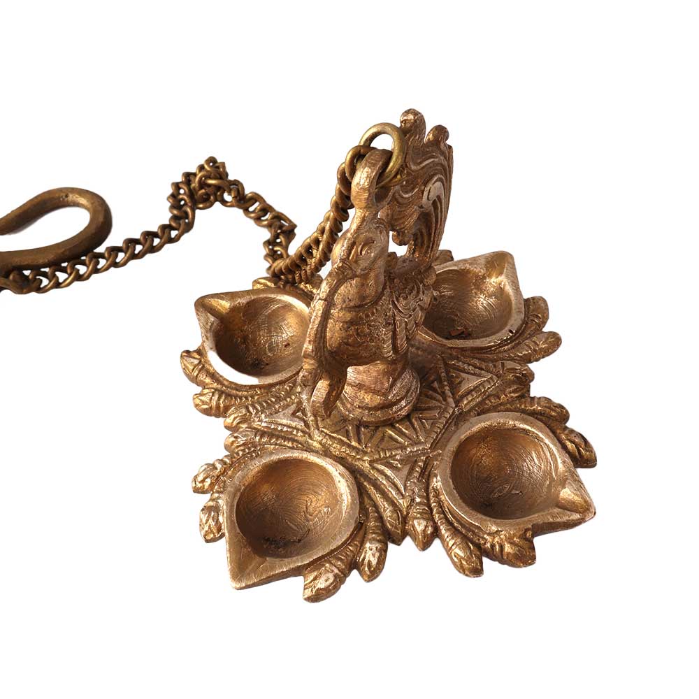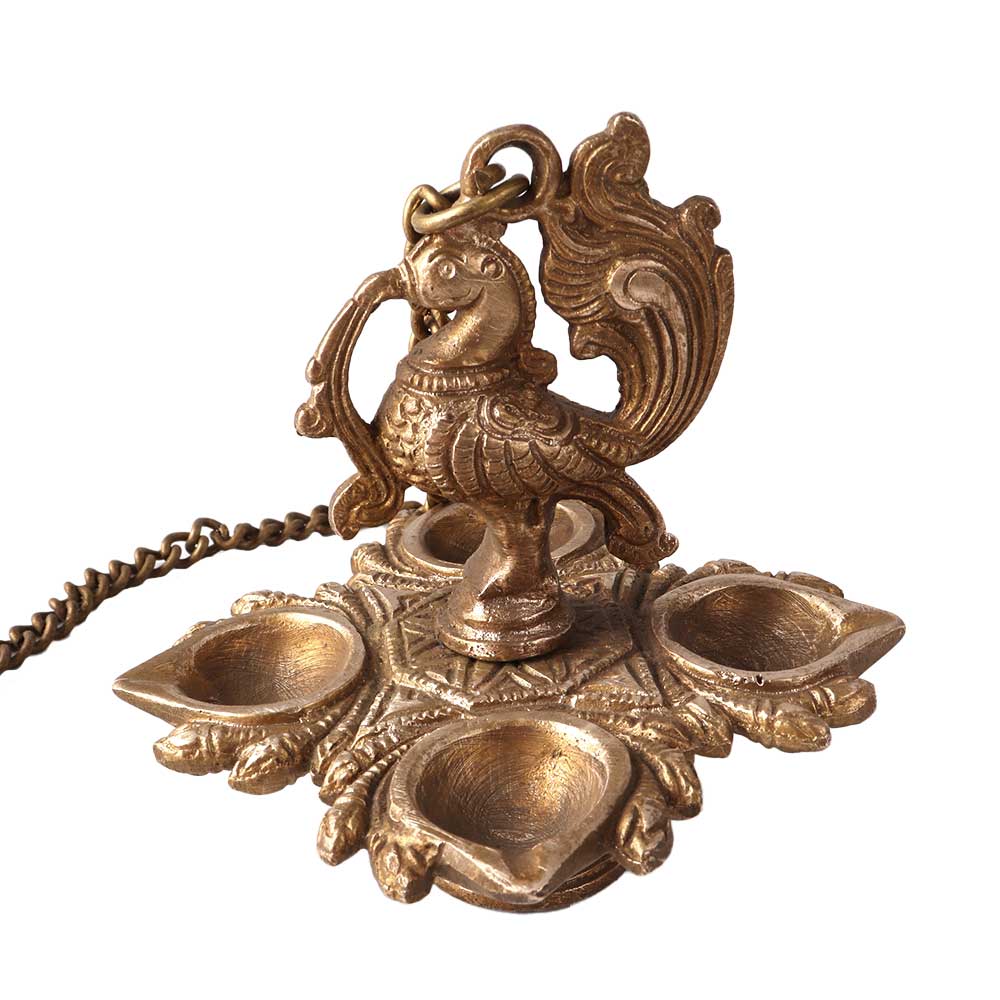 Buy a handmade peacock oil lamp made of pure brass that gives a remarkable impression. This brass oil lamp has a hook and chain for hanging and is a great decorative item to enhance your interior. Light 4 jyots at once to brighten up the house, temple, hotel or restaurant. Brass oil lamps have been used for centuries in temples and homes to produce light and for decoration. Their amazing design makes them an eye-catching collectible for your vintage collection and decoration. Housewarming, anniversary, thank you, birthday, wedding, deepavali, auspicious or corporate gift for your loved ones.