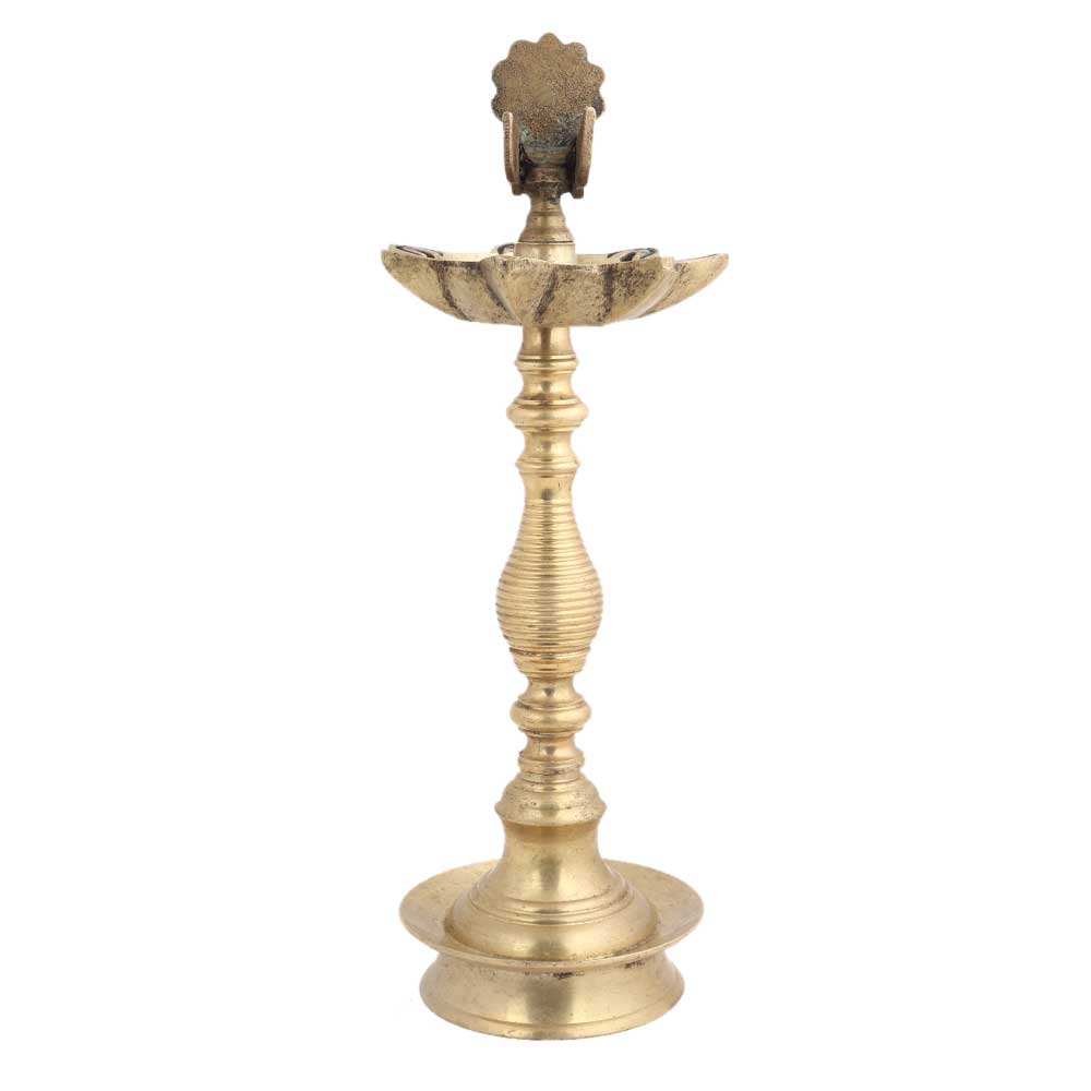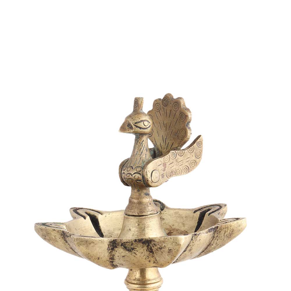 Brass Peacock South Indian Oil Lamp and segmented handle on a round base with a small container to store oil, ghee or other fuel. It is used during Diwali decoration, stage decoration, weddings, religious and inaugural functions. Gift for your family and friends.