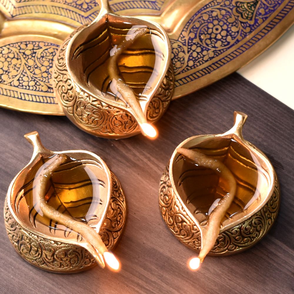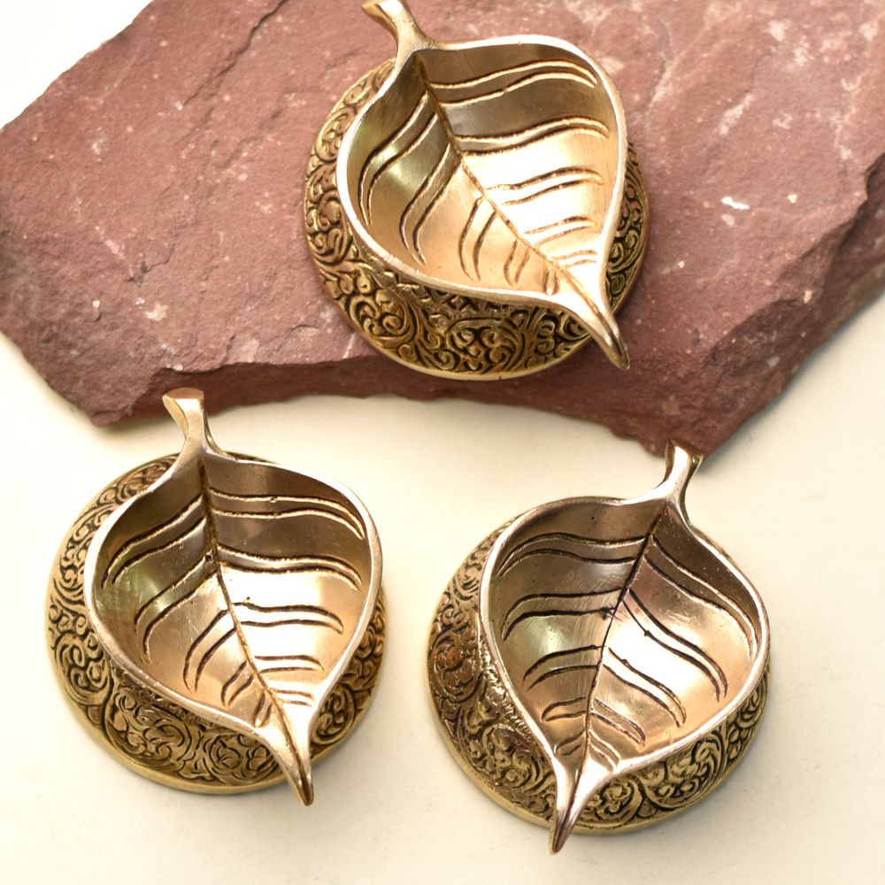 Illuminate your sacred spaces with this Brass Peepal Leaf Diya, a handcrafted oil lamp designed to embody spiritual growth and divine blessings. Made from solid brass with a radiant golden finish, it sits on a decorative base for added elegance and stability. The symbolic Peepal leaf, revered in Indian tradition, makes this diya an auspicious choice for Diwali décor, mandir rituals, and meaningful gifting.