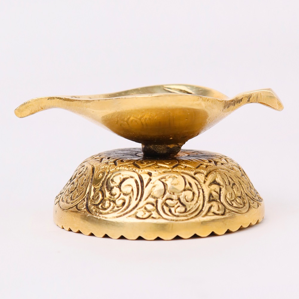 Indianshelf.com for bulk/wholesale orders.Indianshelf.us for personal purchases.Illuminate your rituals with the Brass Peepal Leaf Oil Lamp Diya on Decorative Base, a piece that blends tradition, artistry, and symbolism. Shaped like the revered peepal leaf, this diya symbolizes enlightenment, wisdom, and divine blessings. Crafted from solid brass with a golden polish, it rests on a decorative base that adds elegance and stability, making it ideal for mandir décor, Diwali celebrations, and auspicious gifting.