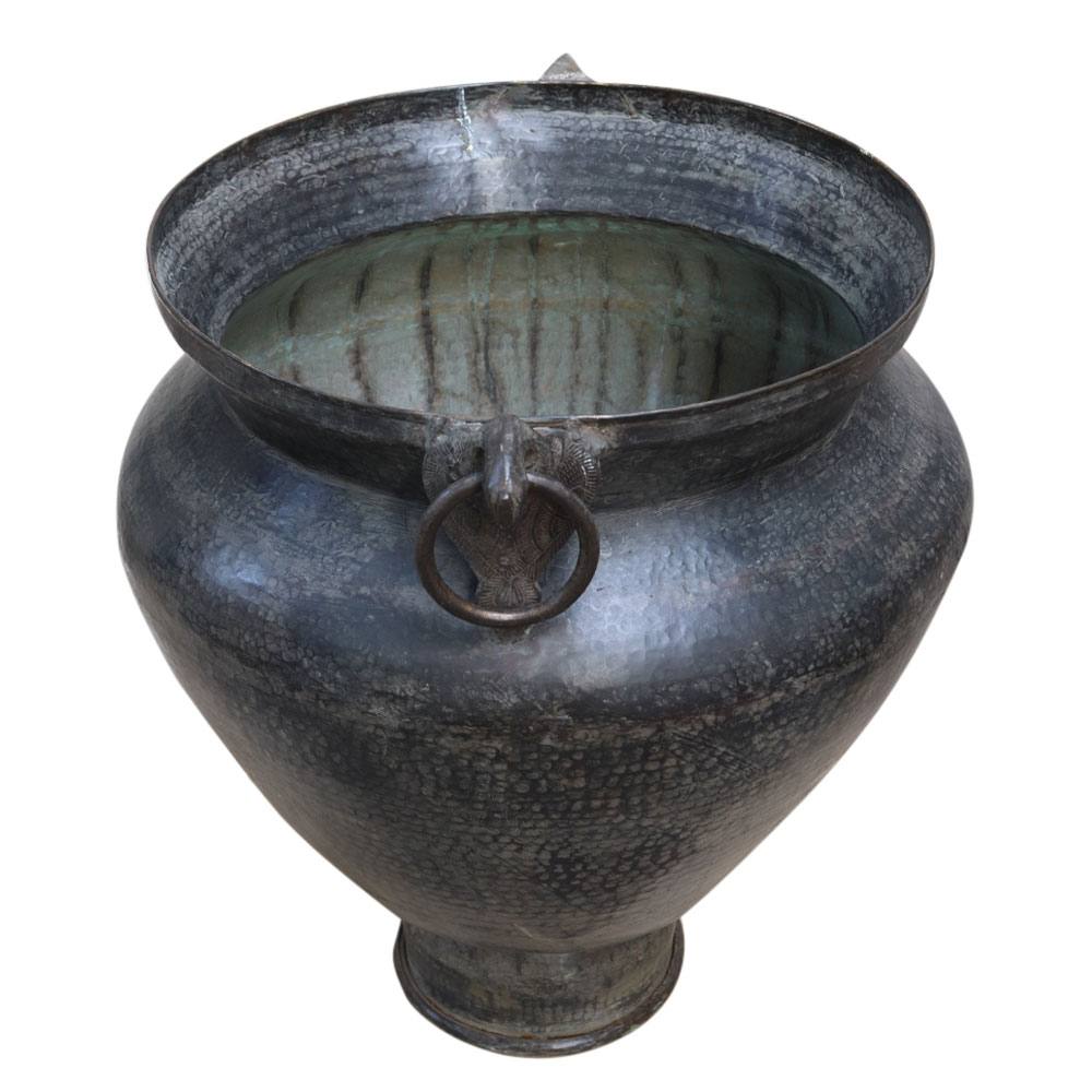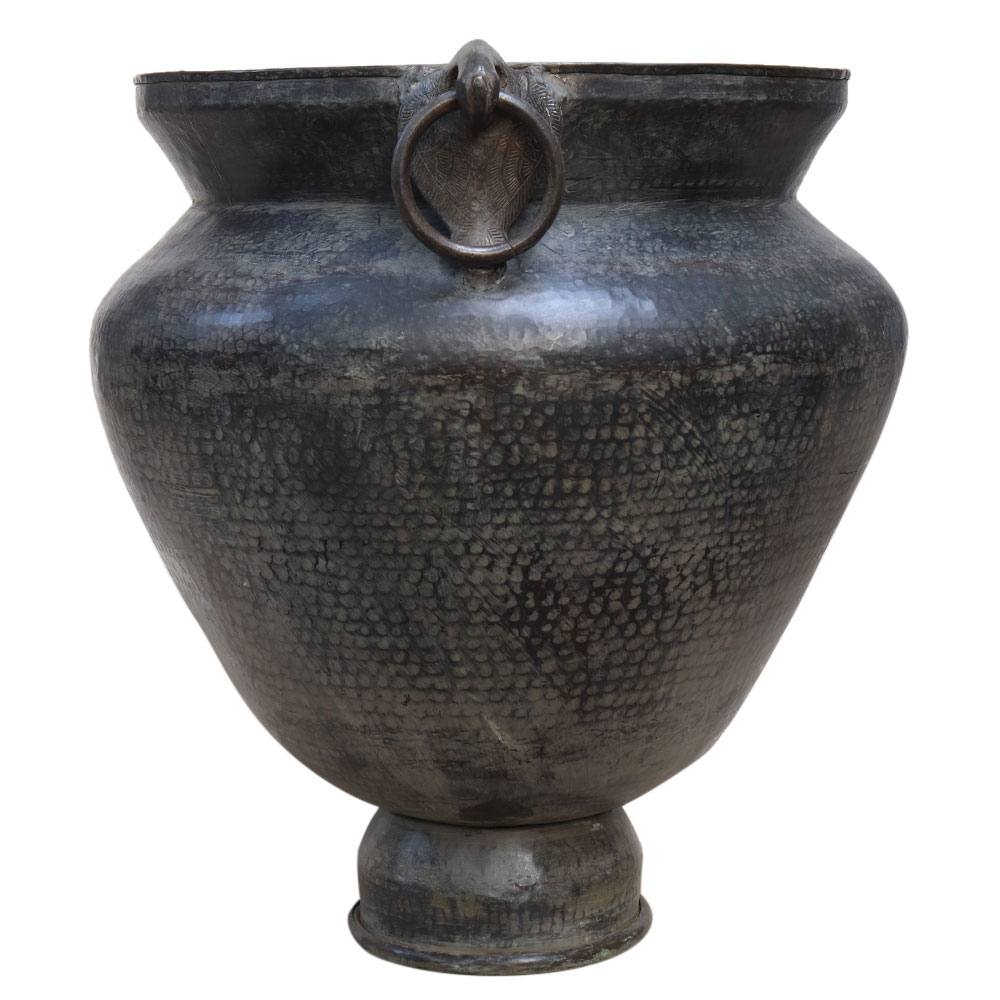A beautiful large antique brass plate urn planter. The urn has floral and leafy engravings. A pedestal stand is connected to the planter. It is quite strong and in decent condition, however there is some rim wear and tarnishing. This gives it a weathered patina and enhances its vintage tale.
