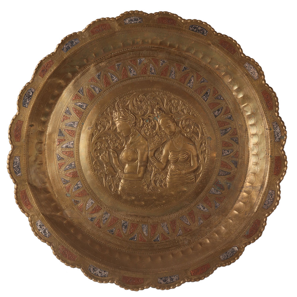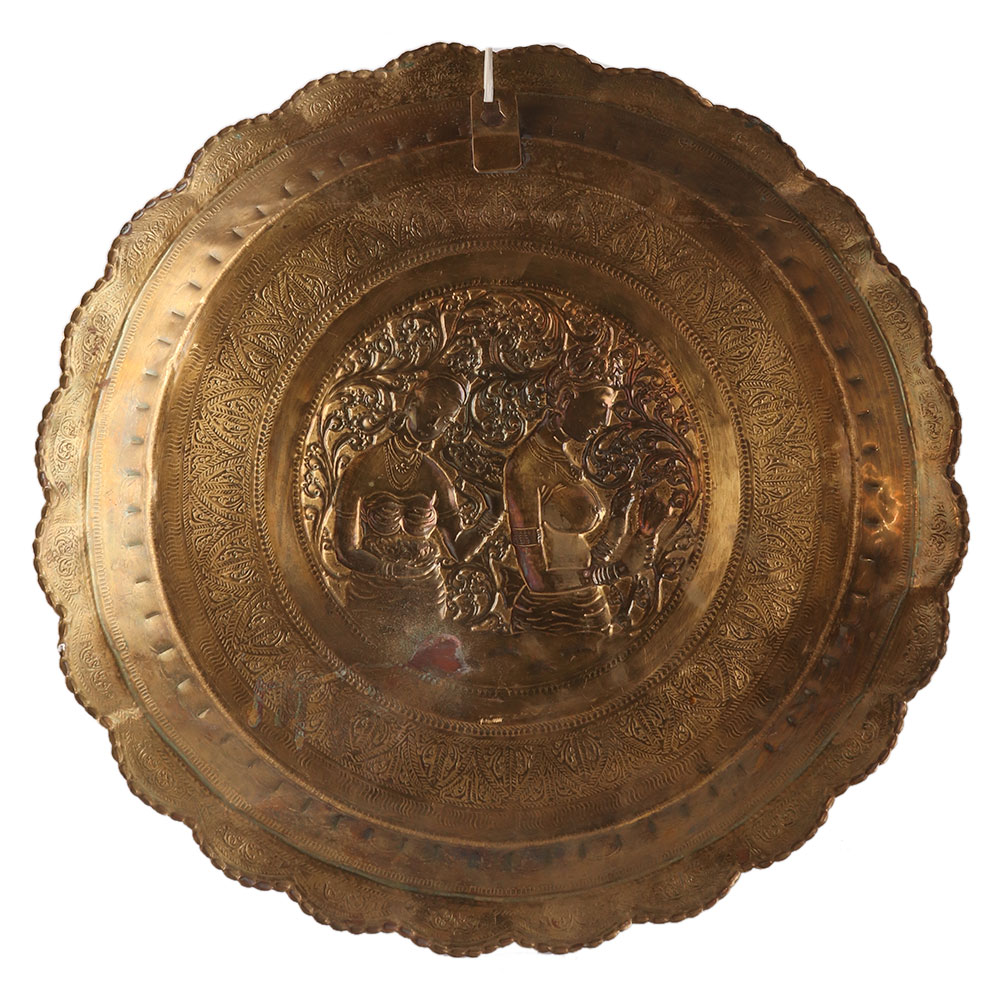 The old brass plate or tray with male and female images is a beautifully crafted piece of traditional art. Made of brass, this Brass decoration plates or tray features intricate designs and images of a male and female figure, both depicted in traditional attire. The intricate designs and patterns etched into the copper give the tray a timeless and classic look, making it a great collectible item for fans of traditional art and history. The Wall decoration plates or tray can also serve a functional purpose, such as serving food or displaying decorative items. The old brass tray with male and female images is a unique and eye-catching piece that would make a stunning addition to any collection or home. The cultural significance and artistic value of the tray make it a piece worth treasuring for generations to come.