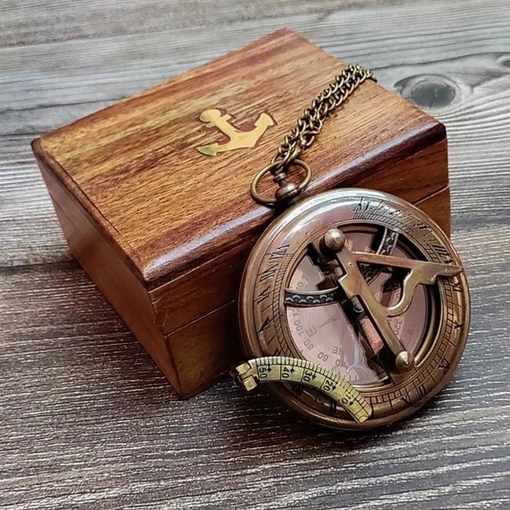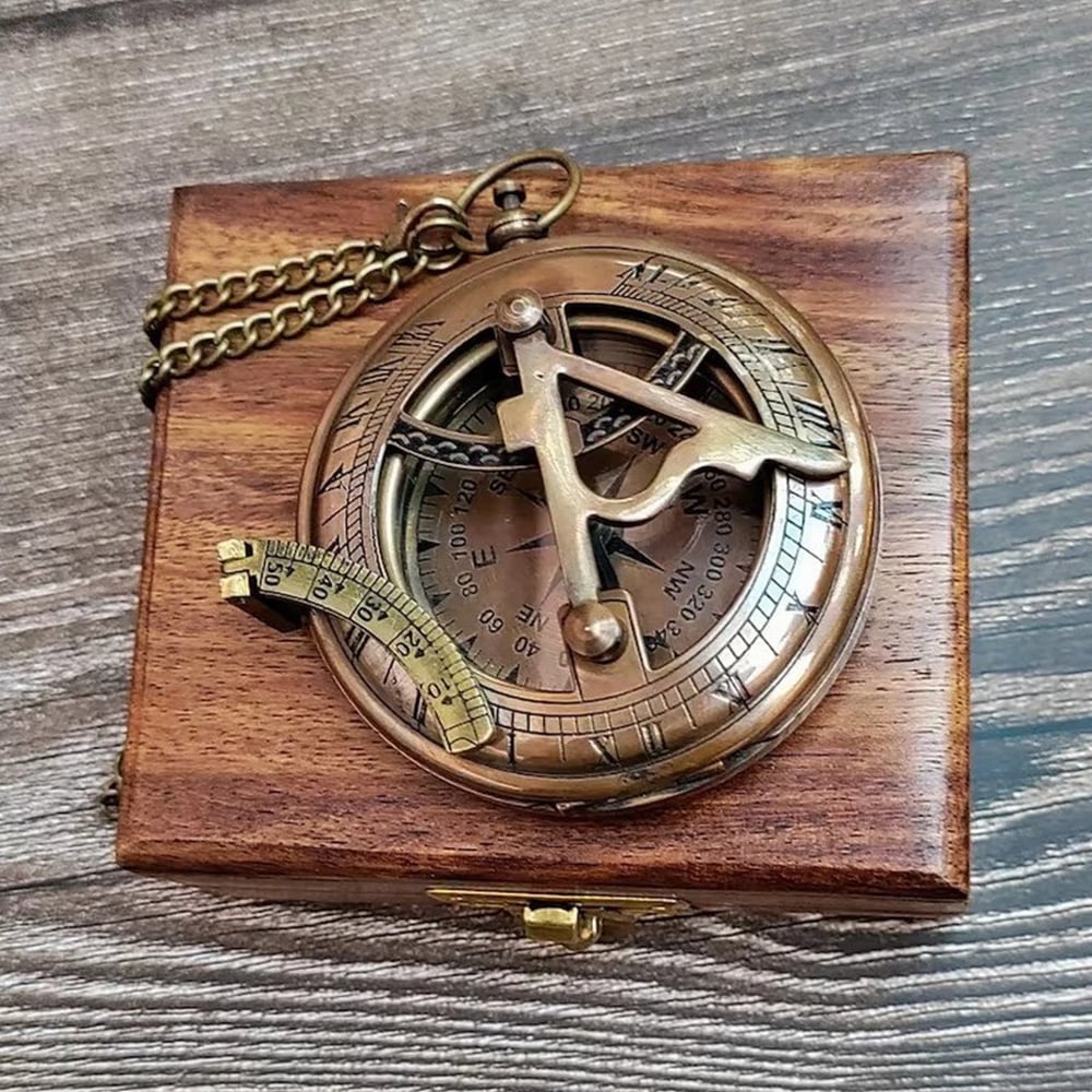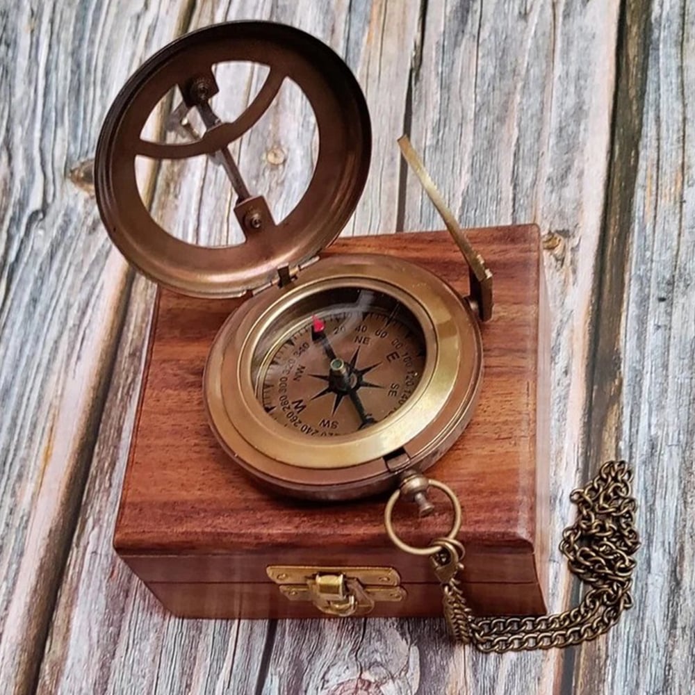 Introduce timeless navigation heritage into your space with this brass pocket compass displayed on a wooden box. Crafted from solid brass, the compass reflects traditional navigation instruments once used by explorers and travelers. The hinged lid, clear directional dial, and attached chain are complemented by a polished wooden box that enhances its presentation and collectible appeal.