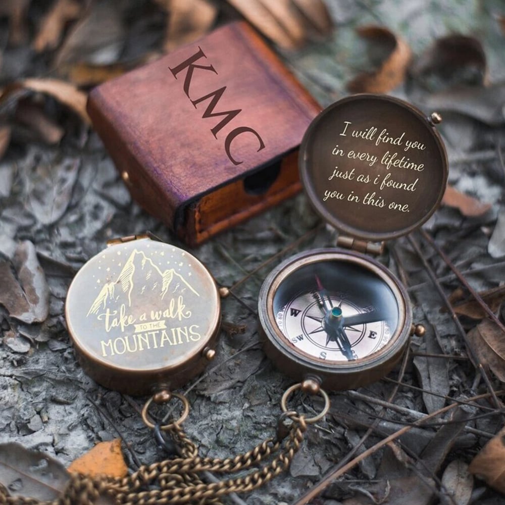 Celebrate journey, connection, and exploration with this brass pocket compass gift set featuring engraved lids and a wooden presentation box. Crafted from solid brass, each compass reflects traditional navigation instruments while adding a personal, symbolic layer through engraved artwork and text. The warm brass finish, classic compass dial, and matching chain create a piece that feels both timeless and meaningful.