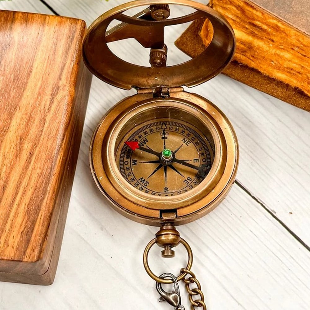 Add timeless navigation character to your collection with this brass pocket compass with chain. Crafted from solid brass and finished with a naturally aged patina, this compass reflects the design of traditional navigation tools once carried by travelers and explorers. The hinged protective lid, clear directional markings, and attached brass chain give this piece both functional heritage and decorative appeal.
