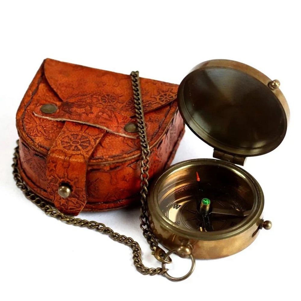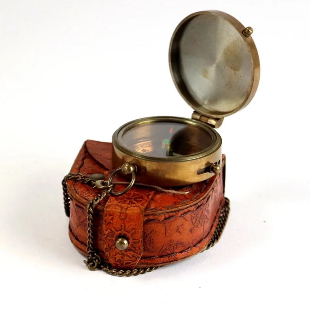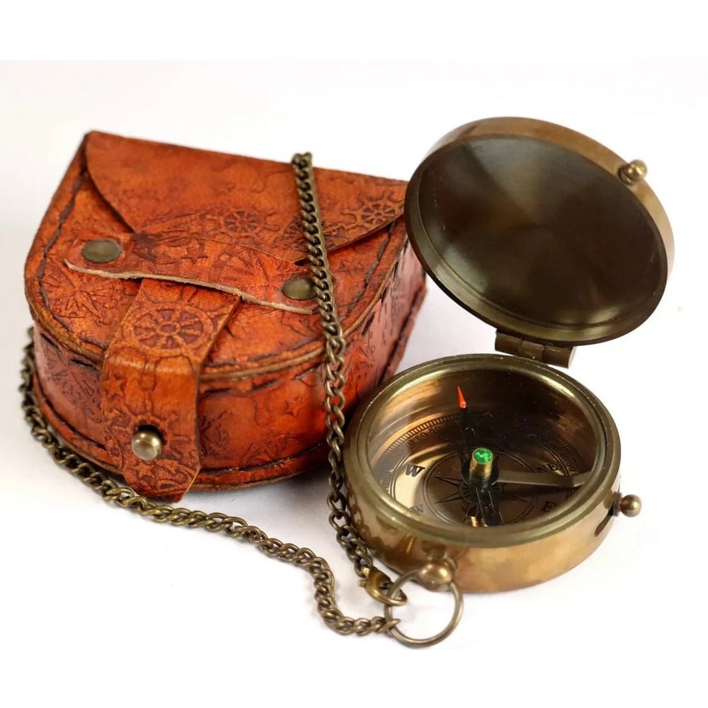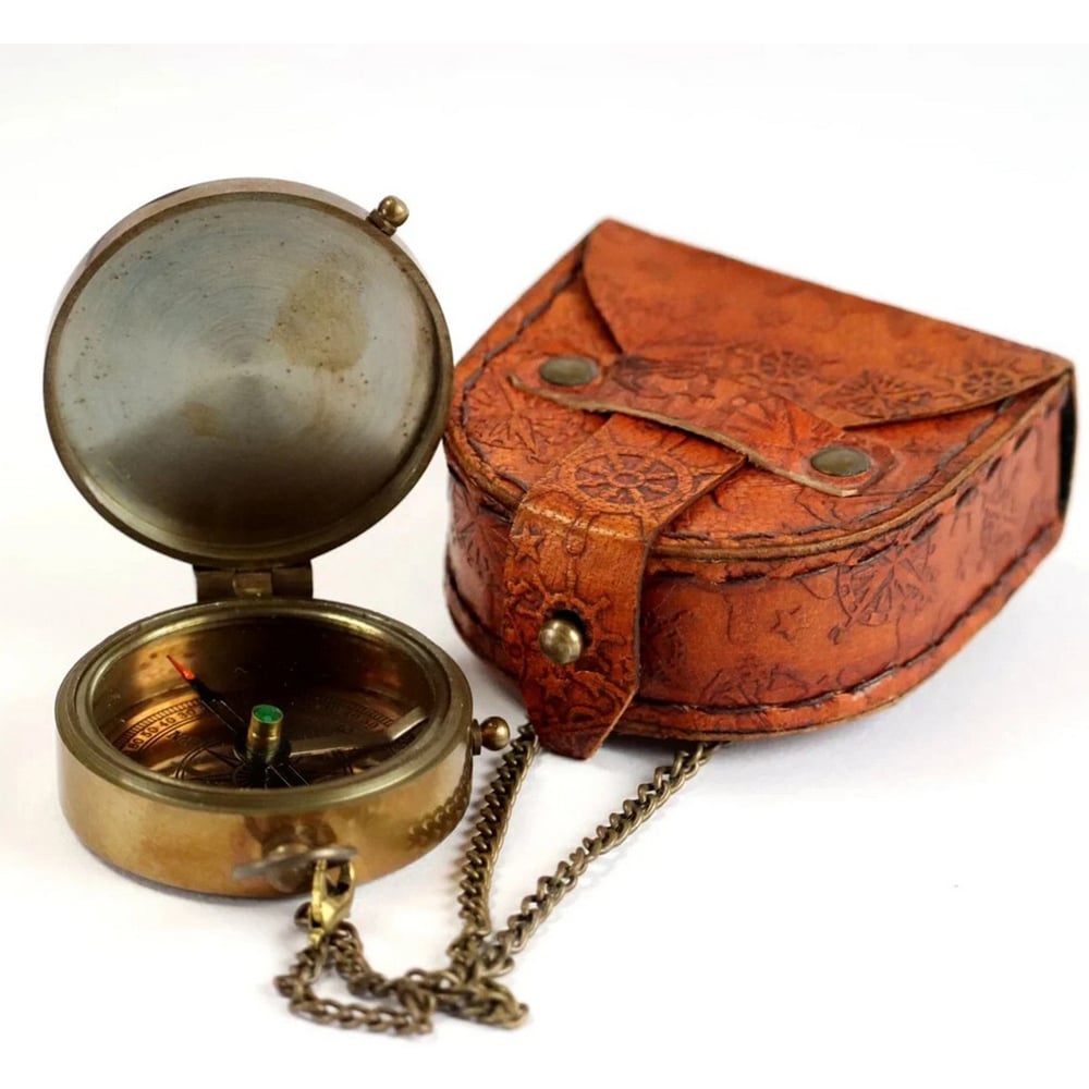 Introduce classic navigation heritage into your collection with this brass pocket compass paired with a leather case and chain. Crafted from solid brass, the compass reflects traditional instruments once carried by explorers and travelers, while the fitted leather case adds protection and historical character. The warm brass tone, clear directional dial, and aged leather detailing create a piece rich in authenticity and craftsmanship.