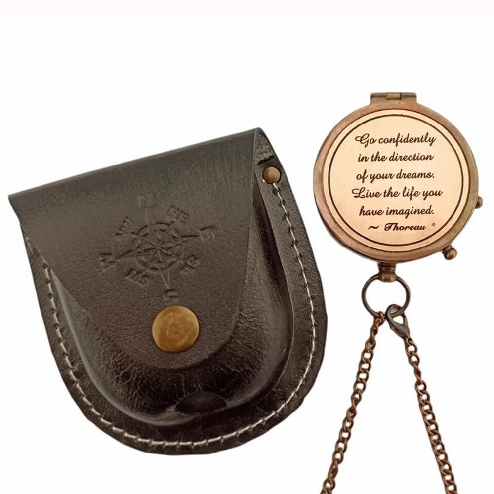 Combine timeless navigation with personal inspiration through this brass pocket compass with quote and leather case. Crafted from solid brass, this compass features a hinged lid engraved with a motivational quote, adding emotional depth to a classic navigation instrument. The accompanying leather case provides protection and enhances its traditional character, making this piece both meaningful and collectible.