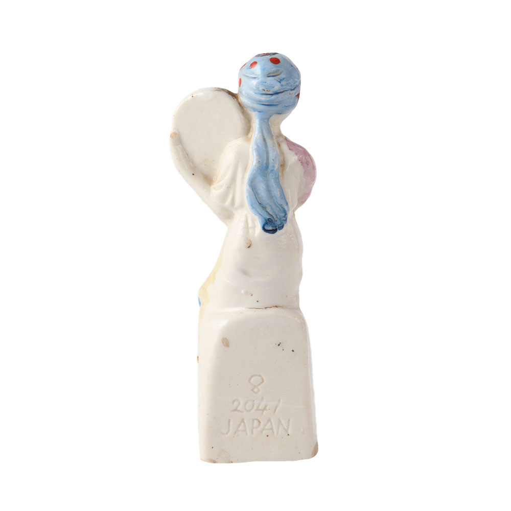 Hand painted porcelain figurine of a woman holding a dhapli, a type of kind of instrument. The woman is wearing business attire, and her hair is wrapped in a pretty scarf. These kinds of figurines are frequently given as gifts to friends and family and used as a conversation starter and a piece of attention.