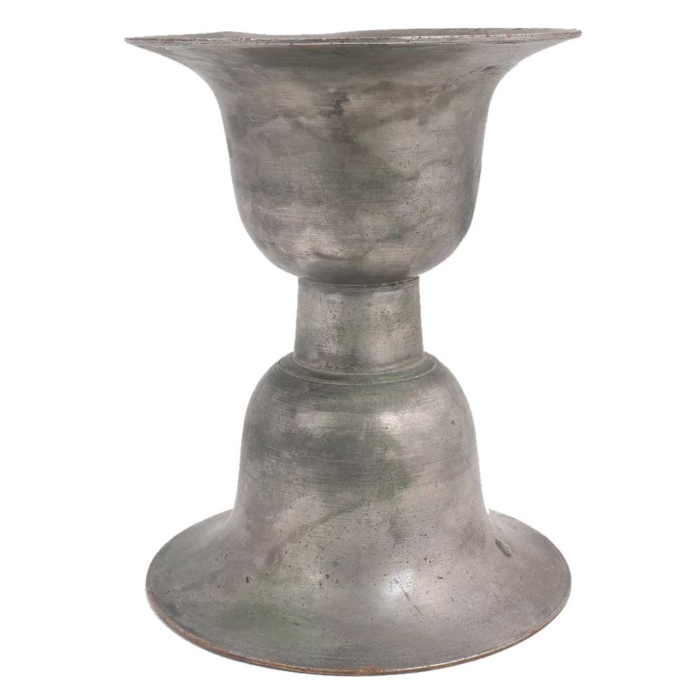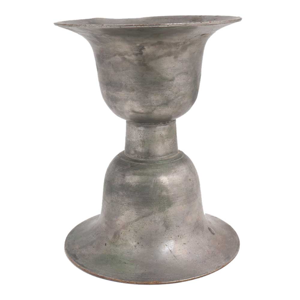 This traditional incense burner has a flared shape and is held by a handle . It has a cup on top and bottom as base. The handle is long and thick as is gets heated up by burning coconut husk on which incense is sprinkled.
