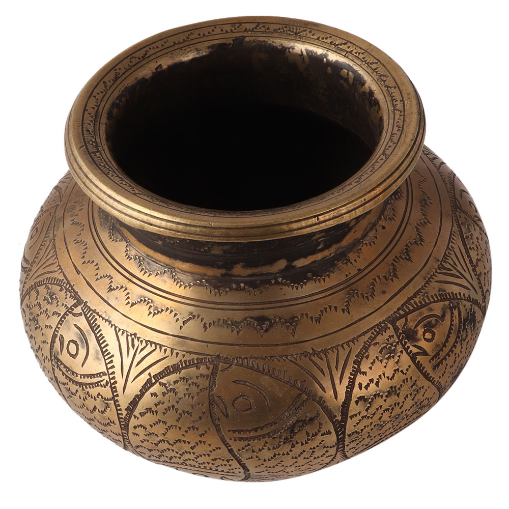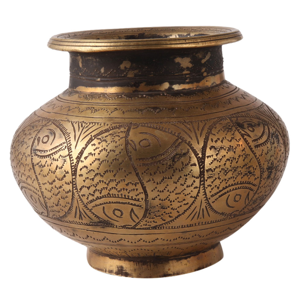A brass pot with fish carved design is a decorative and functional item that is made out of brass and features a fish carving on its surface. These pots are often used in traditional and cultural settings, such as in homes, temples, brass pot for pooja, and other religious spaces. They can be used for a variety of purposes, such as holding flowers, incense sticks, or other small items. The fish design is often symbolic of good luck, prosperity and harmony. The brass material is durable and gives the pot a classic, elegant look. These pots can be found in various sizes and styles, from small, portable versions to larger, more elaborate designs. They make a great addition to any home decor and can be used for both indoor and outdoor settings. They are also great as a gift item and are often given as a traditional or cultural gift in many countries. The brass flower pot with fish carved design is often used as a traditional decorative item and also used in pooja and religious ceremonies.