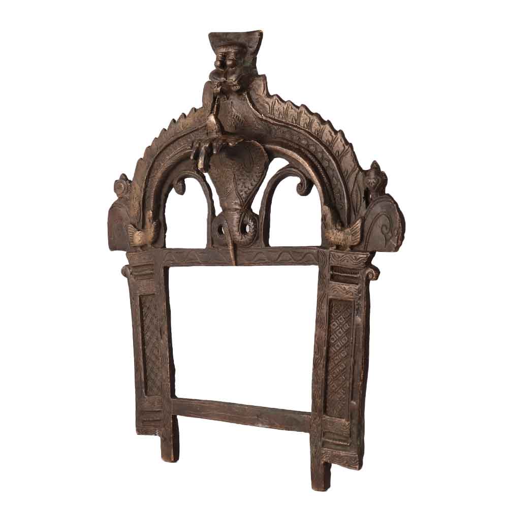 A brass prabhavali or prabhawal frame for god or decoration in the house. This prabhavali is handmade from high quality brass in South Indian art using ancient methods. It is engraved with beautiful motifs and a snake with seven heads. This prabhawal can be used in prayer rooms or temples and for decoration at home, office, restaurant, hotel or cafe and as a vintage collection. A fascinating find for vintage art lovers to add to their collection. Its unconventional design sets it apart from other brass Prabhavali and an ideal gift for auspicious occasion to your loved ones.