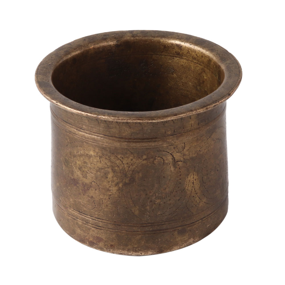 Holy water panch patra cup for hindu temple worship made of brass and  is hand carved. It is traditionally used to adorn our kitchens in addition to being used for religious purposes. Ideal for prayers, festivals, auspicious occasions, and pujas.