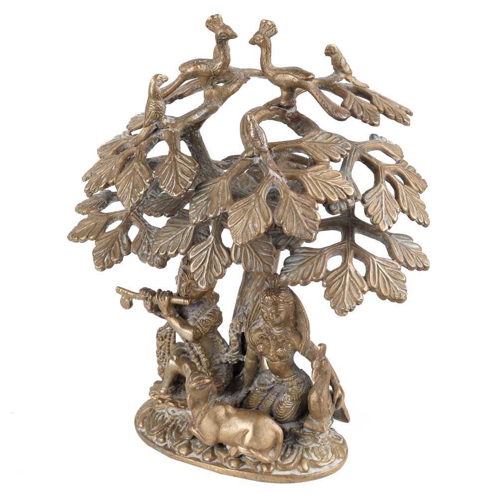 • Brass Radha Krishna Sitting Under Tree with Peacock And Cow Metal Showpiece