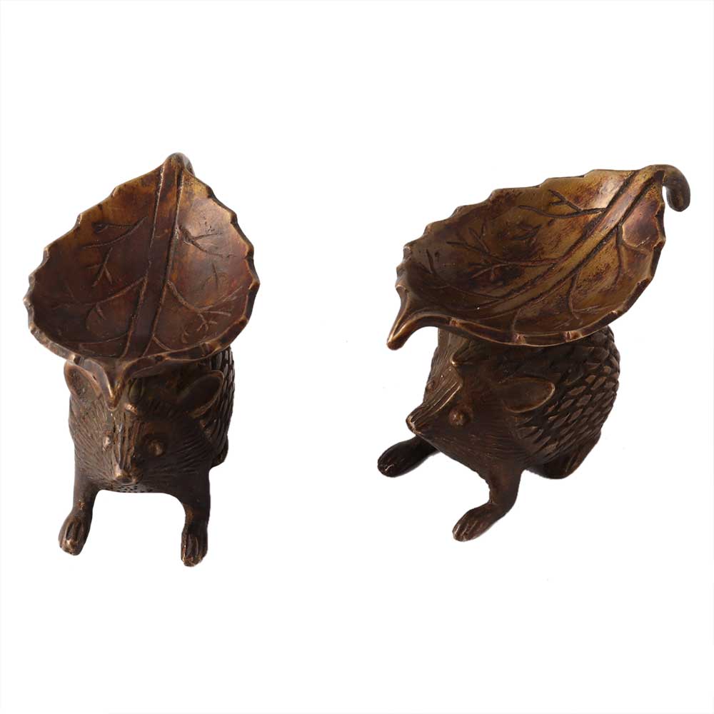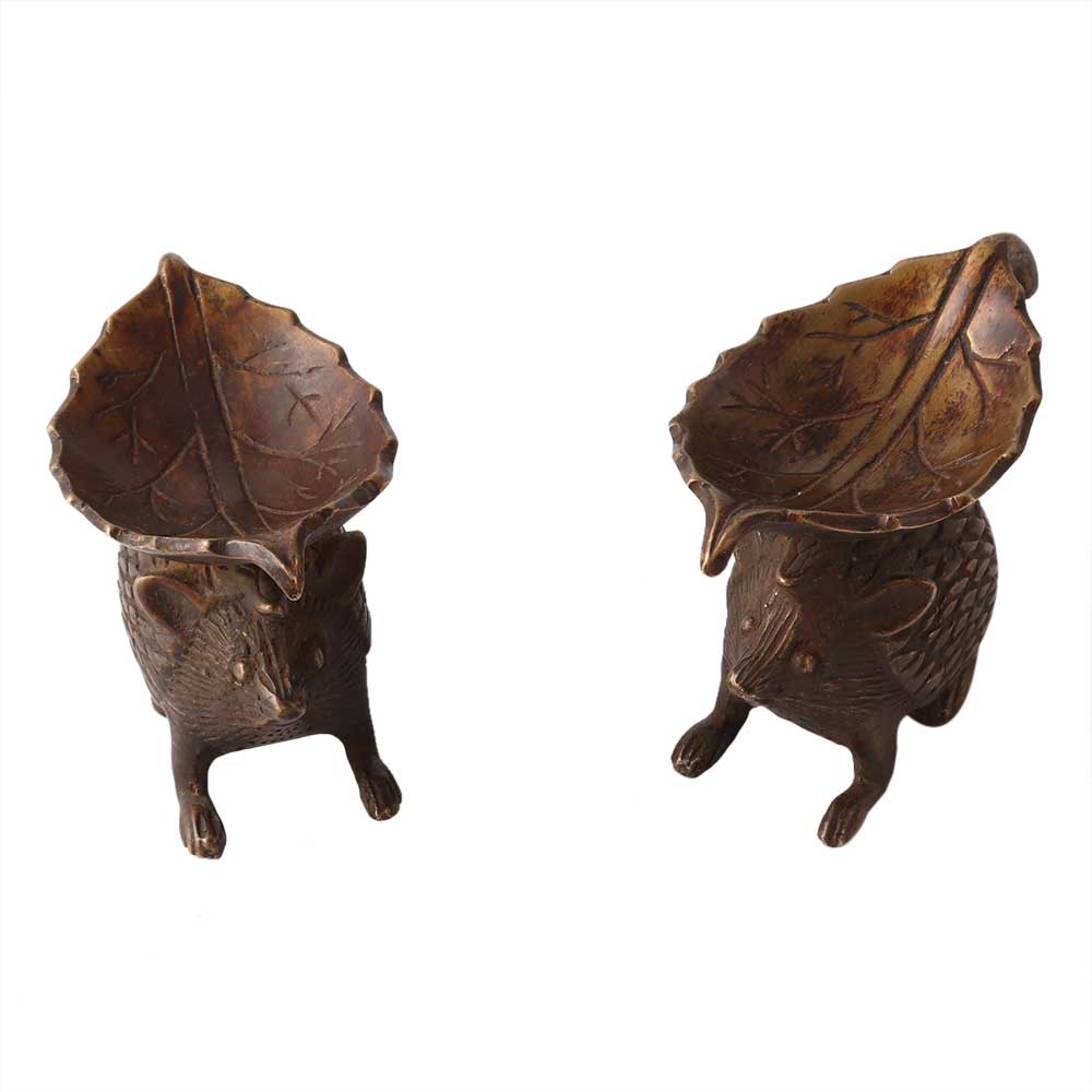 A pair of old Brass oil lamps in the shape of a leaf placed above a brass Rat in brown patina finsh. The pure brass diya is artistically carved with exquisite features. The represents longevity, protection, help, money, and prosperity. This will create attractive décor and a serene ambiance, and it will bring harmony, long life, and riches to your home, according to Vastu Shastra. The high quality of the material protects the product from easy breaking. A brass Rat also represents good luck, so it may be a unique and considerate gift that your loved ones will love.