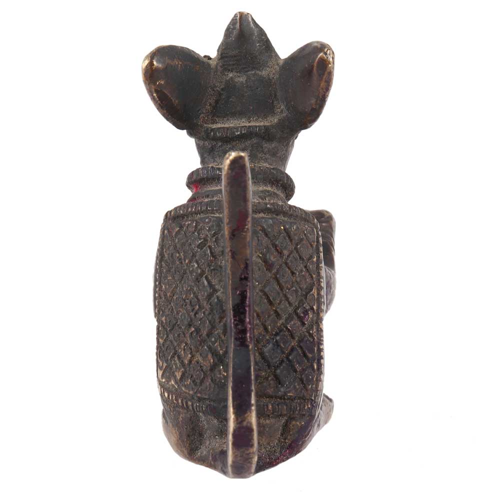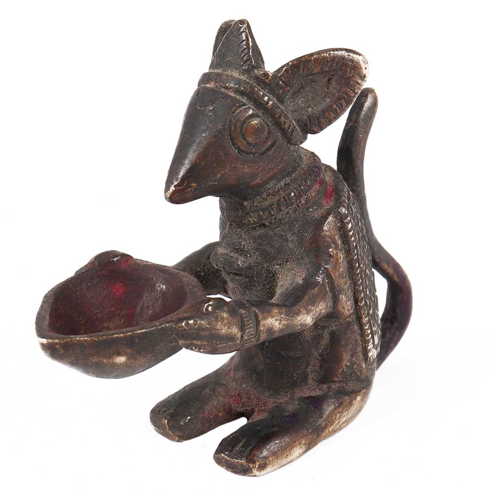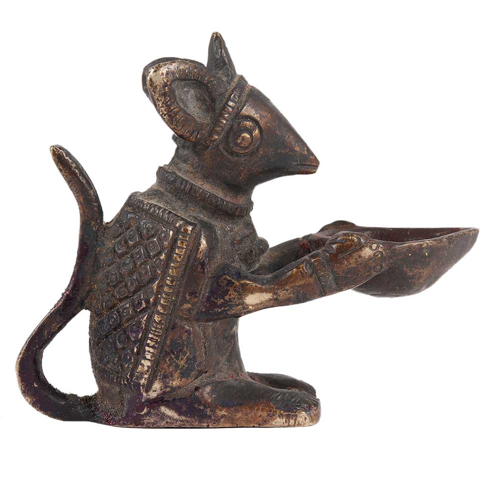 This lovely brass idol of Lord Ganesha's Mushak (Mouse), vahan or vehicle, is shown holding a traditional diya in his hands. Introduce this lovely statue home for good luck and good fortune. It could be used as a display statue or kept in the Temple Puja Room with an idol of the Hindu God Ganesha, Divya Mantra.