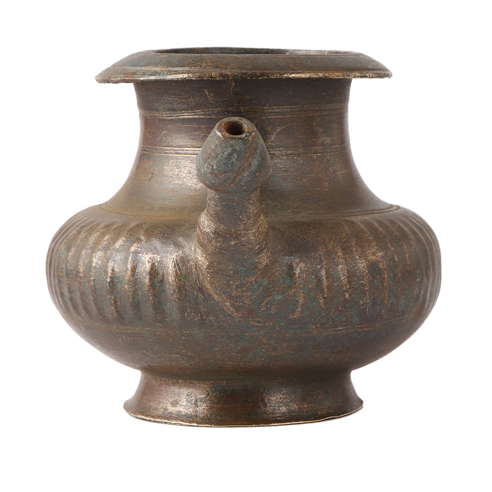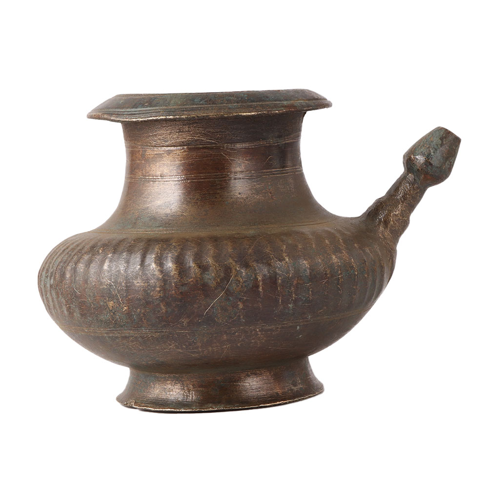 India's skilled artisans created this handcrafted brass water pot with a spout. This brass vessel can hold holy water and has a bulbous body. It was used in temples and other places of worship and has a lovely patina. It supports itself with a bottom rim and can hold a lot of water thanks to a large belly and a spout that is attached to one side of the pot. The brass holy water pot has a spout that allows users to empty the container's contents. This brass pot is the perfect item for wedding gifts, Diwali gifts, hotel, restaurant, and spa decorations, as well as kitchen and table decorations.