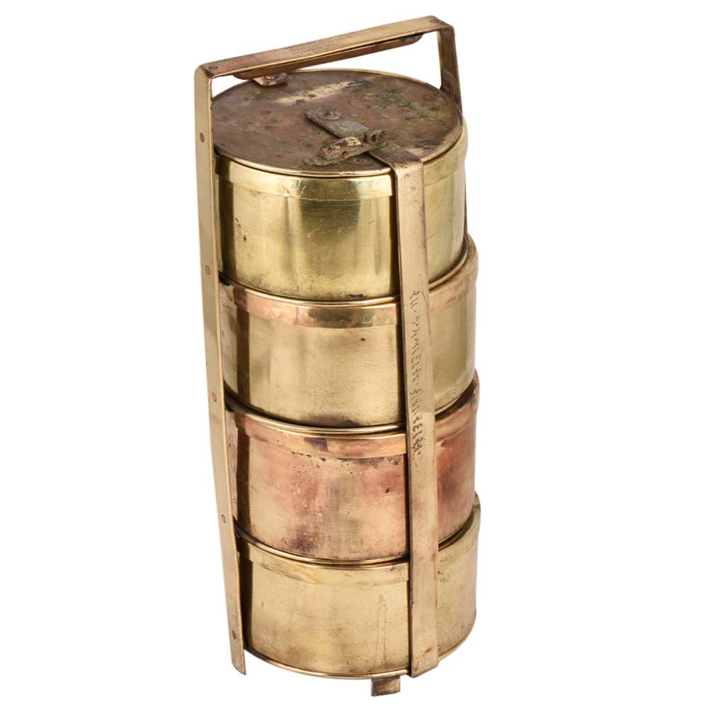 Functional brass Tiffin box with four containers place in a ring frame and a latch on the top container. Each container has its individual lid and is sealed with the help of a thick frame that keeps all the containers intact. Gift it to your near ones on diwali, Christmas, new year or house warming. Use it as a showpiece or a table decoration kitchenware.