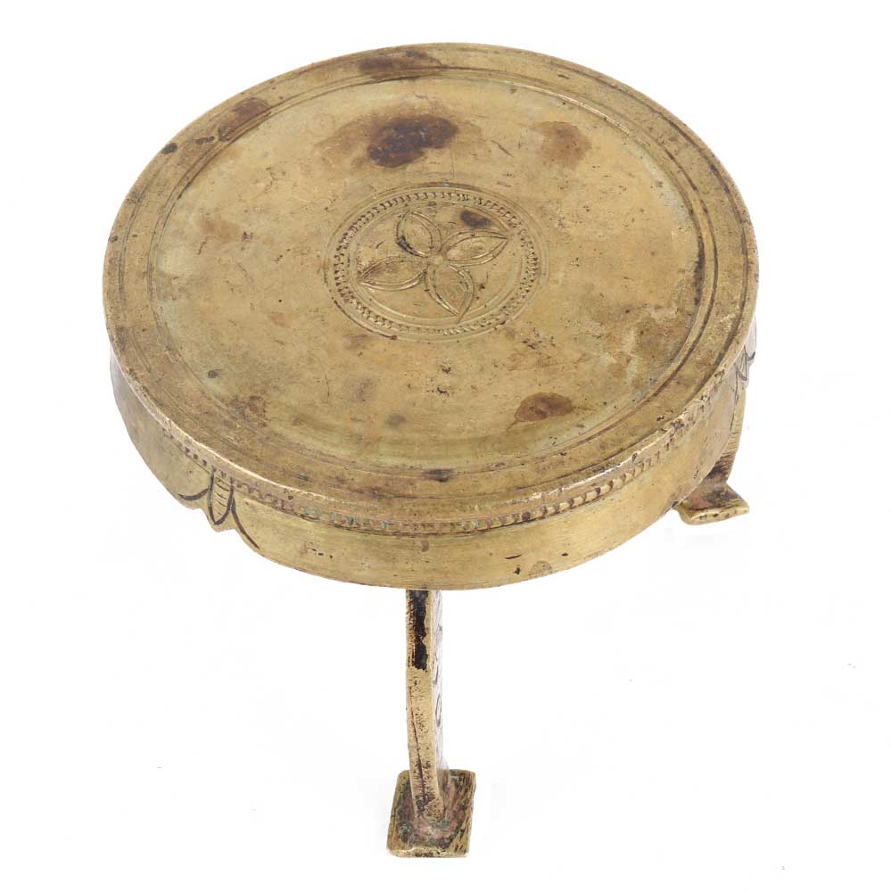Decorate your home temple with this extraordinary brass stand or chowki. It has an engraved design that is appealing for use at a home temple, on a desk, or on a shop shelf or pooja mandir.
