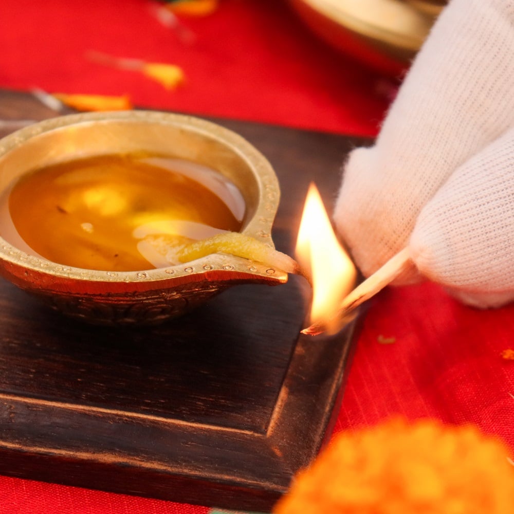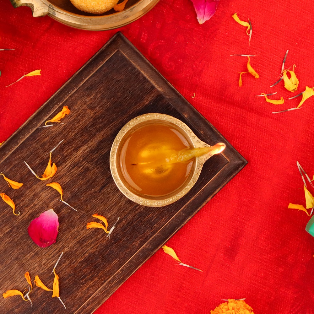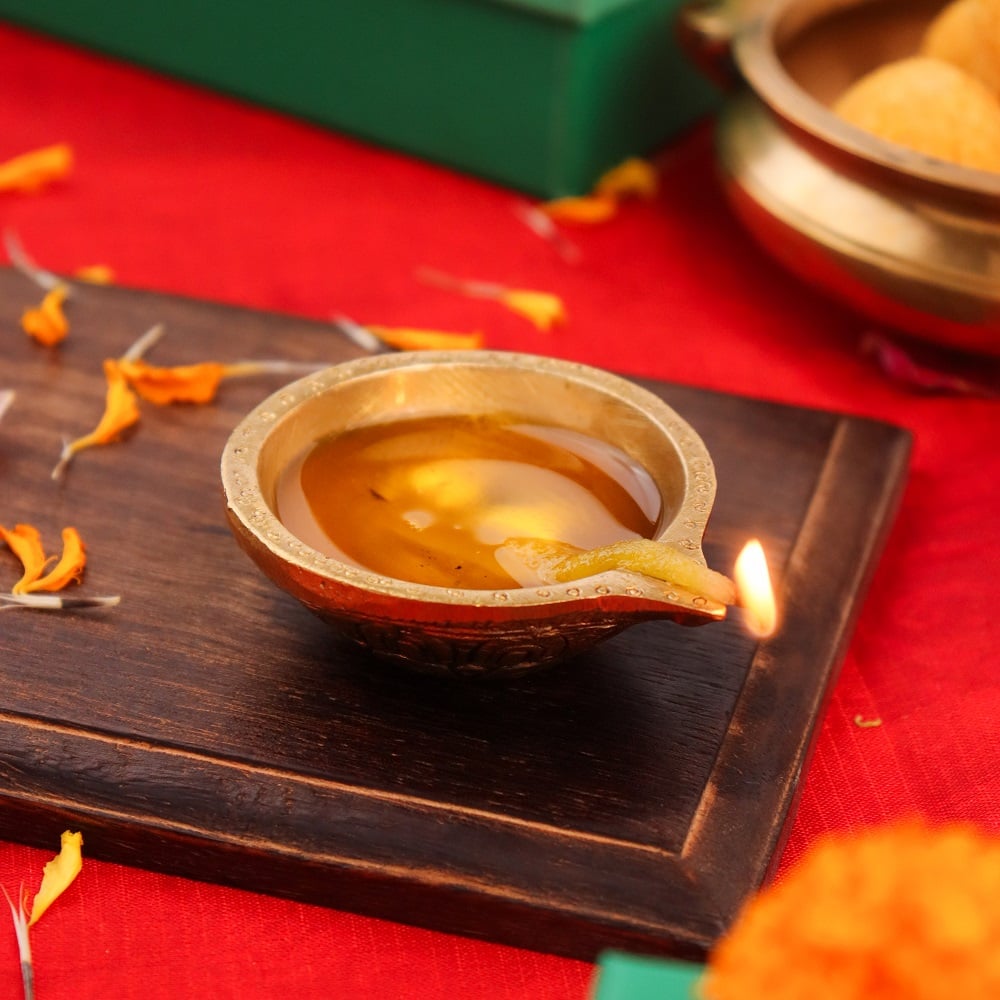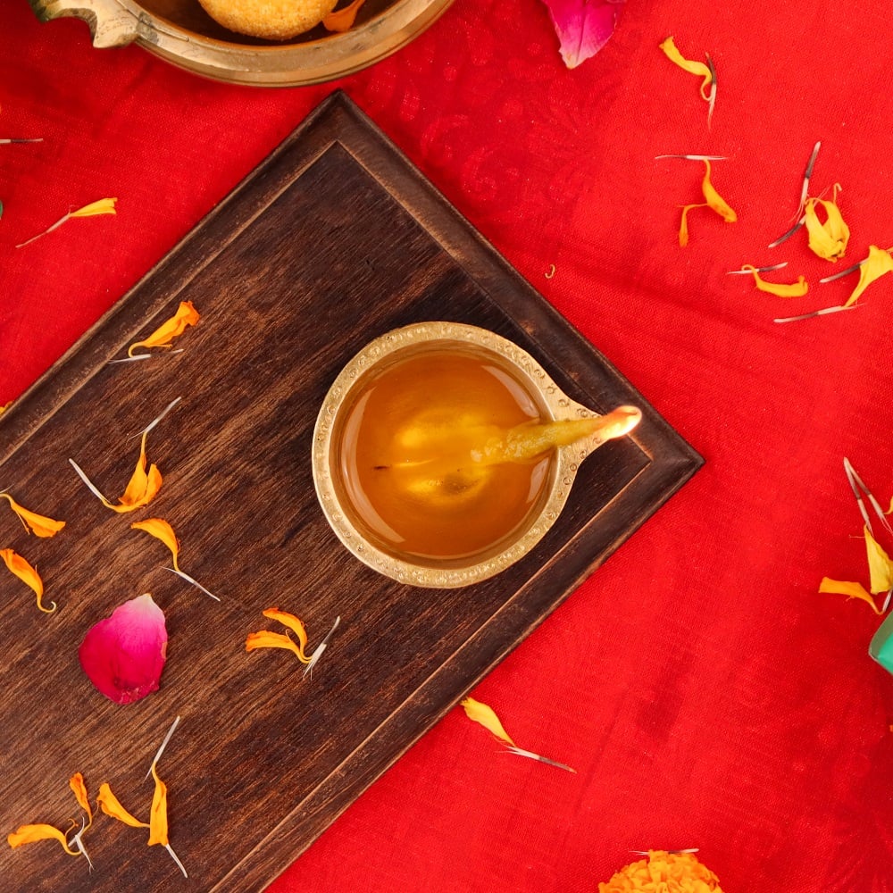 Mustard oil, ghee, or any traditional puja oil can be used.