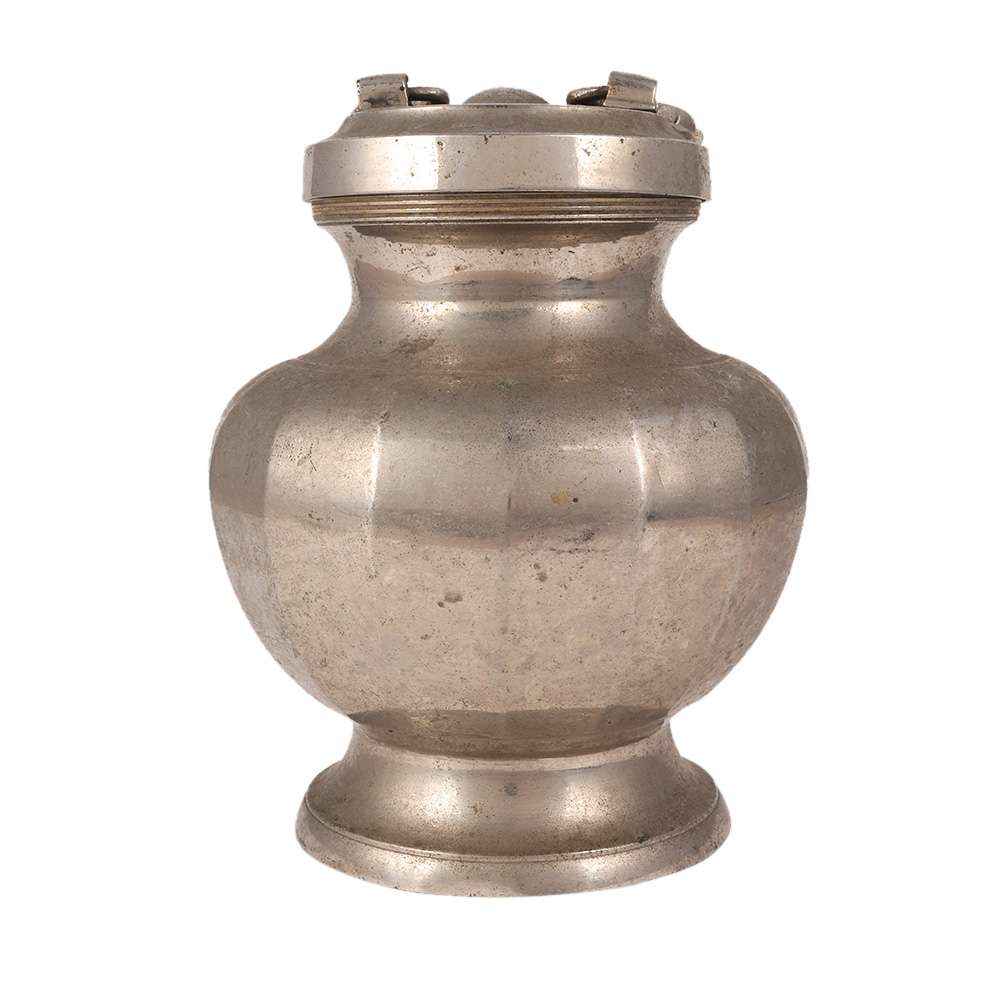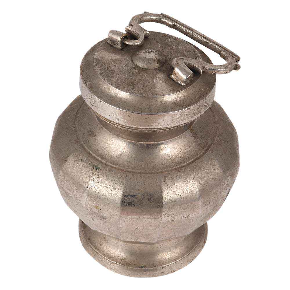 A thick brass chambu, or holy water vessel, with a lid. The chambu is a Hindu lota or water vessel that originated in Benares as a receptacle for holy Ganges water. Use it to decorate your home or office, or as a gift for loved ones.