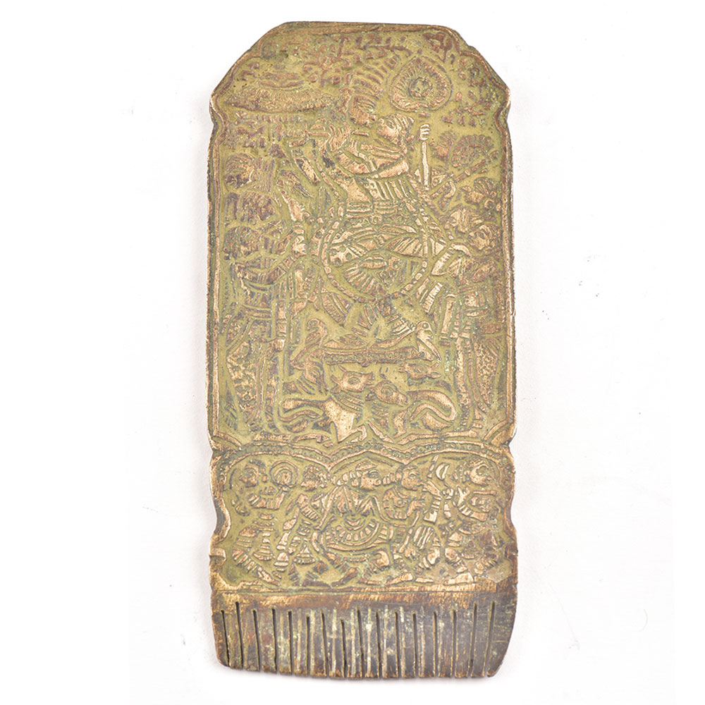 Rare and unique brass idol from Hindu mythology. Detailed, fine & intricate work on brass plate shaped like a comb. The scene depicts indian god with lovely carving . A truly rare piece & collectible from India. Can be framed & hung on wall too.