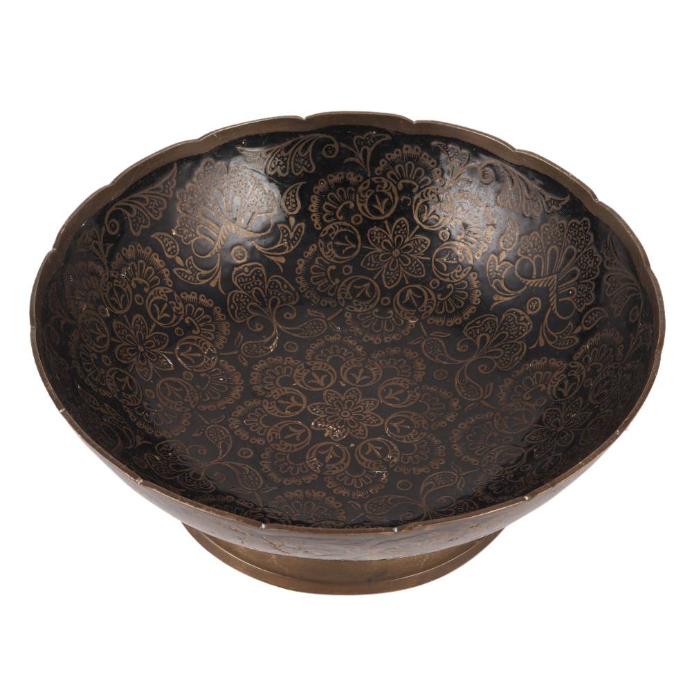This is an antique brass bowl with a rich enamel coating, gorgeous floral motifs, and scalloped sides. Use it as a fruit dish or flower vase. The exterior has a gorgeous golden sheen, while the interior has a dark patina. Give it as a present to friends and family.