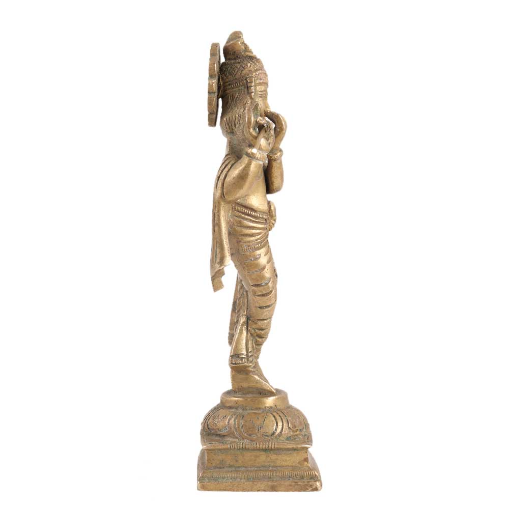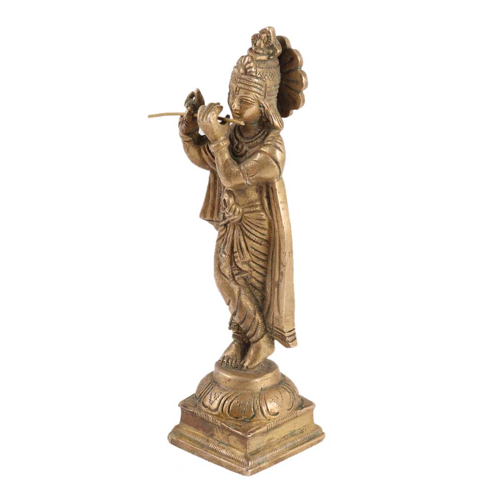 This brass statue depicts Lord Krishna, a Hindu deity. He is an incarnation of the Vedic Supreme God Vishnu, also known as Narayana. Krishna is easily identified by his presentation style. A dark-skinned, usually dark blue, prince dressed in yellow, wearing a crown with a peacock feather in it, and holding a flute near his lips. He is shown in his signature pose, resting and playing the flute, in this statue. He usually stands with one leg bent in front of the other and raises a flute to his lips in this form, known as Tribhangi Mudra. The name Krishna Tribhangi comes from the Sanskrit word tribhangi, which means three curves.