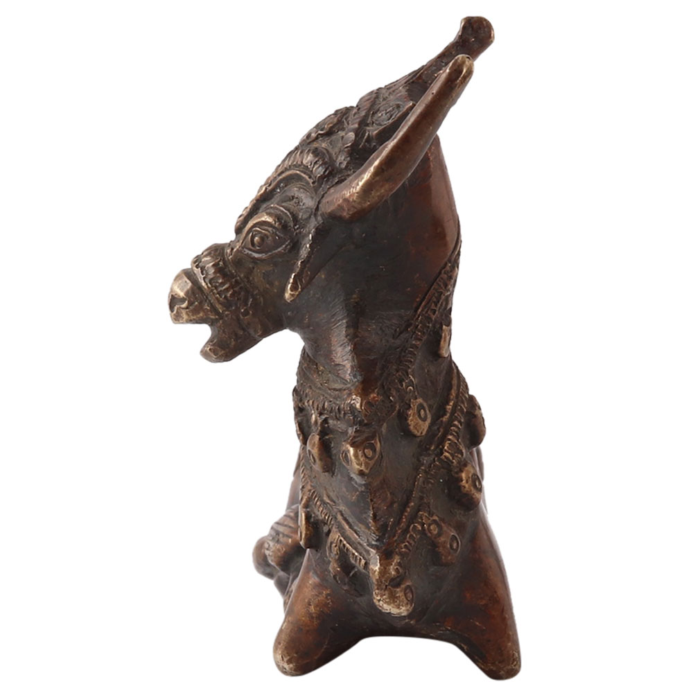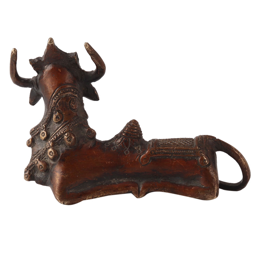 Brass statue of the seated sacred bull Nandi or Nandikeshwara or Nandideva in tribal art. Nandi is the bull Vahan of Lord Shiva and is worshipped in Hinduism. Nandi (meaning "joy giving delight" or " giving joy") should be placed in the southwest zone in the home or office to bring good luck, success, prosperity and divine knowledge. This exquisite sculpture is made with traditional methods to beautify and enchant the interior of your home or office. Housewarming, anniversary or wedding gift for your near and dear ones.