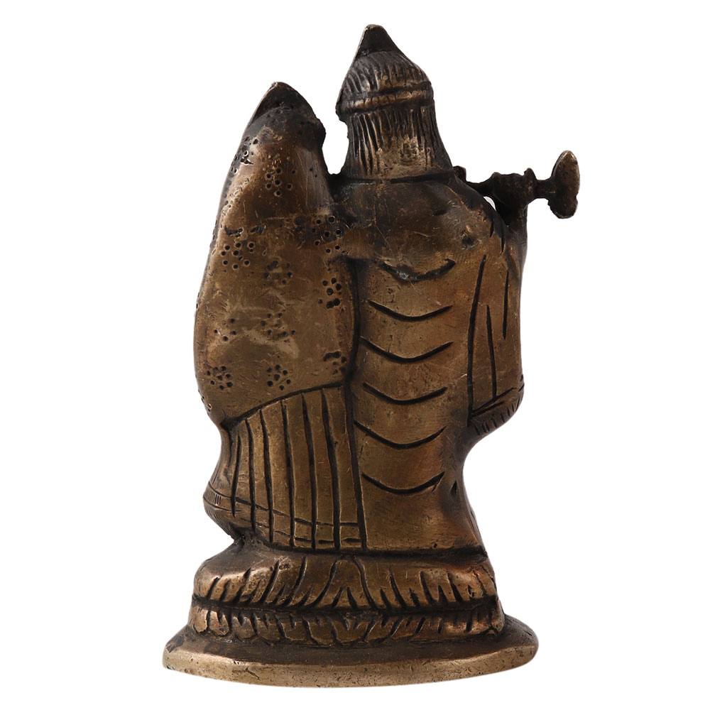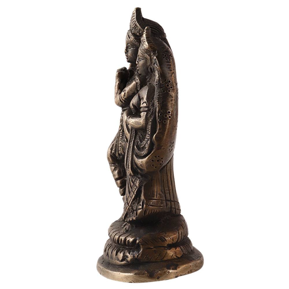 Add a tempting look to your prayer room with this beautiful handcrafted brass statue of Radha Krishna. This statue is perfectly carved from high quality brass using ancient methods. This statue depicts Lord Krishna playing flute with his right leg crossed is facing his left leg and Goddess Radha is standing beside him. Display this handcrafted piece in your prayer room to see its incredible impact in your life. In Hinduism, praying to Radha and Krishna increases love between couples and brings prosperity to the home. An ideal gift for your loved ones.