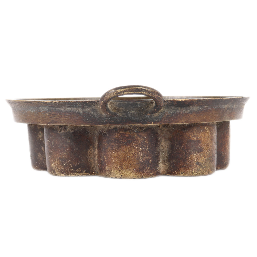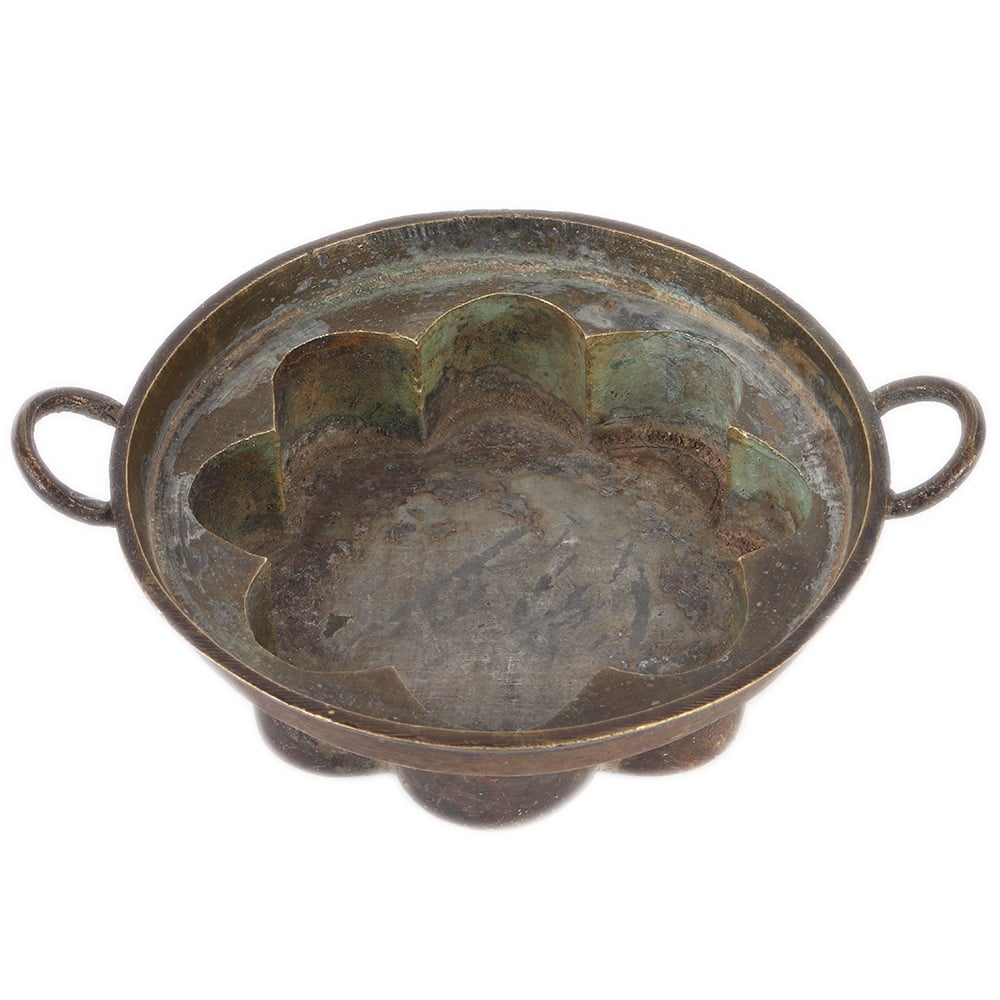 Used antique and authentic solid bronze cooking vessel with handles for cooking traditional favorite south Indian meal. It has a beautiful patina with age and wear qualities from Kerala, India's southernmost state. A fantastic collector's piece.