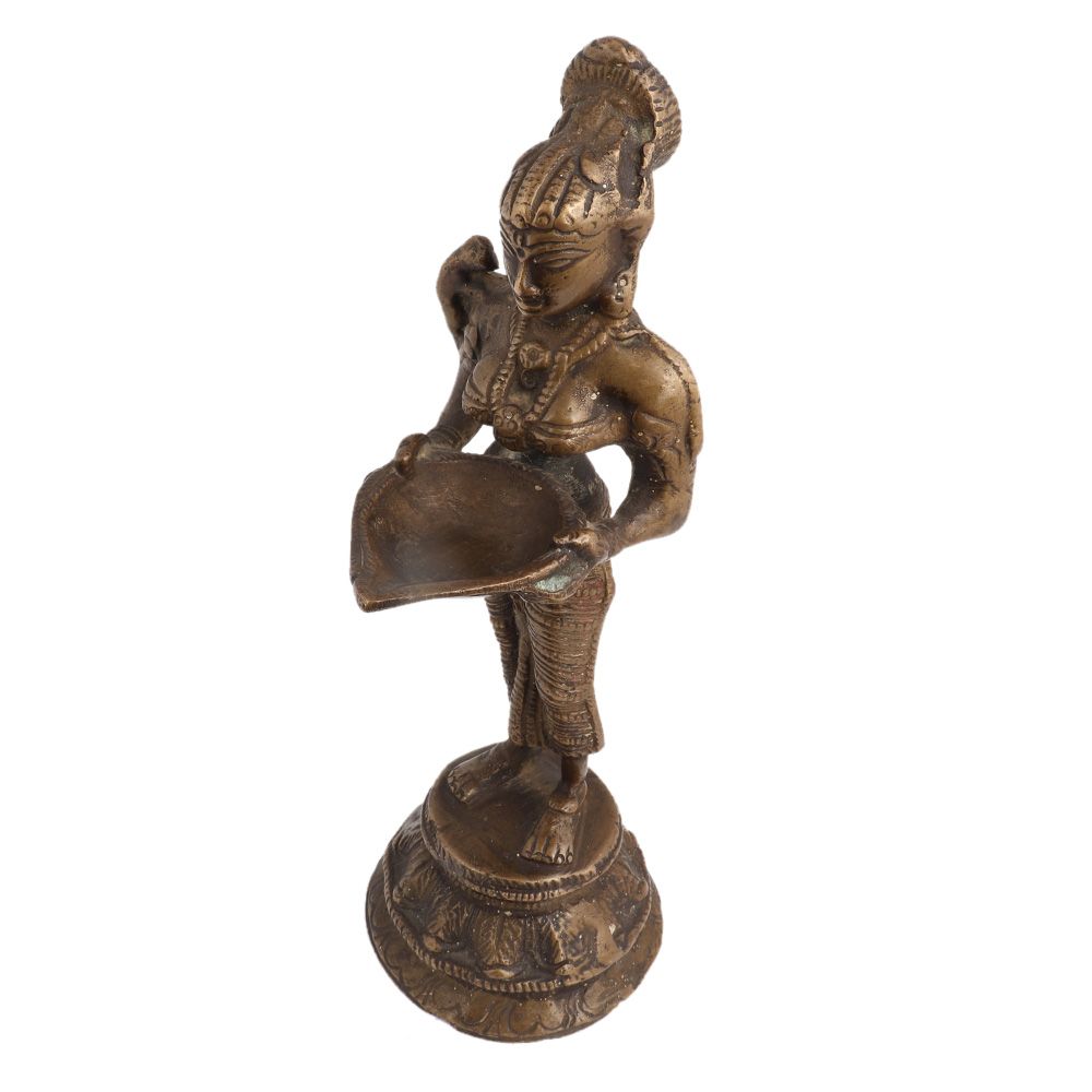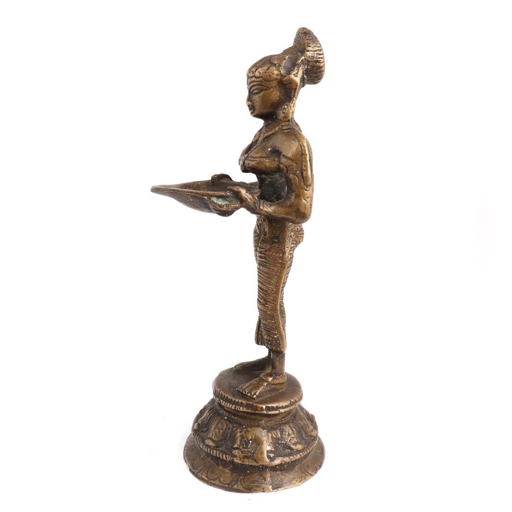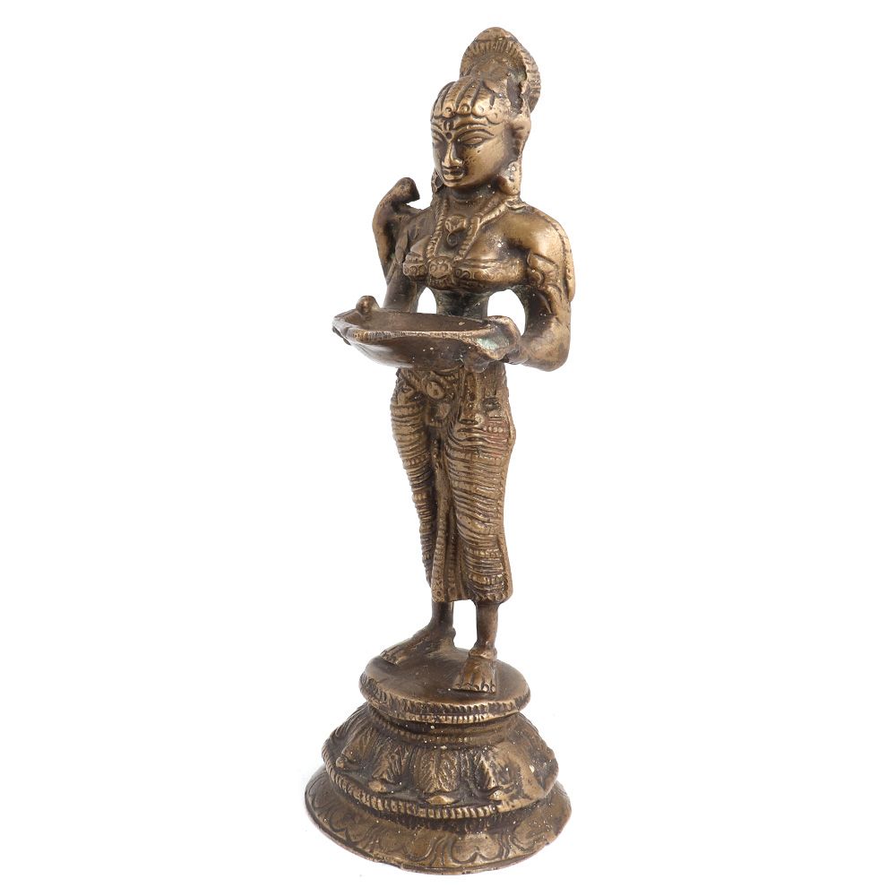 Brass Spiritual Standing Laxmi Goddess Statue holding an oil lamp in her hand, Use it yourself in your poja room, in hotels, restaurants, Schools Etc. Gift it to your near and dear ones on Diwali, new year, wedding, house warming, and birthday gift.