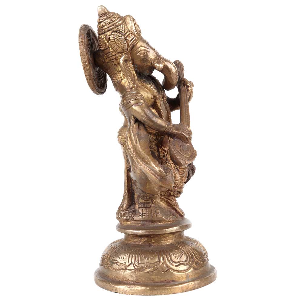 Finely engraved figurine of lord ganesha dancing with a Veena is handmade by the skilled craftsmen of India. This figurine is made of brass and it has very fine detailings which makes it more pretty. It can be used for worshipping, decoration or for gifting.