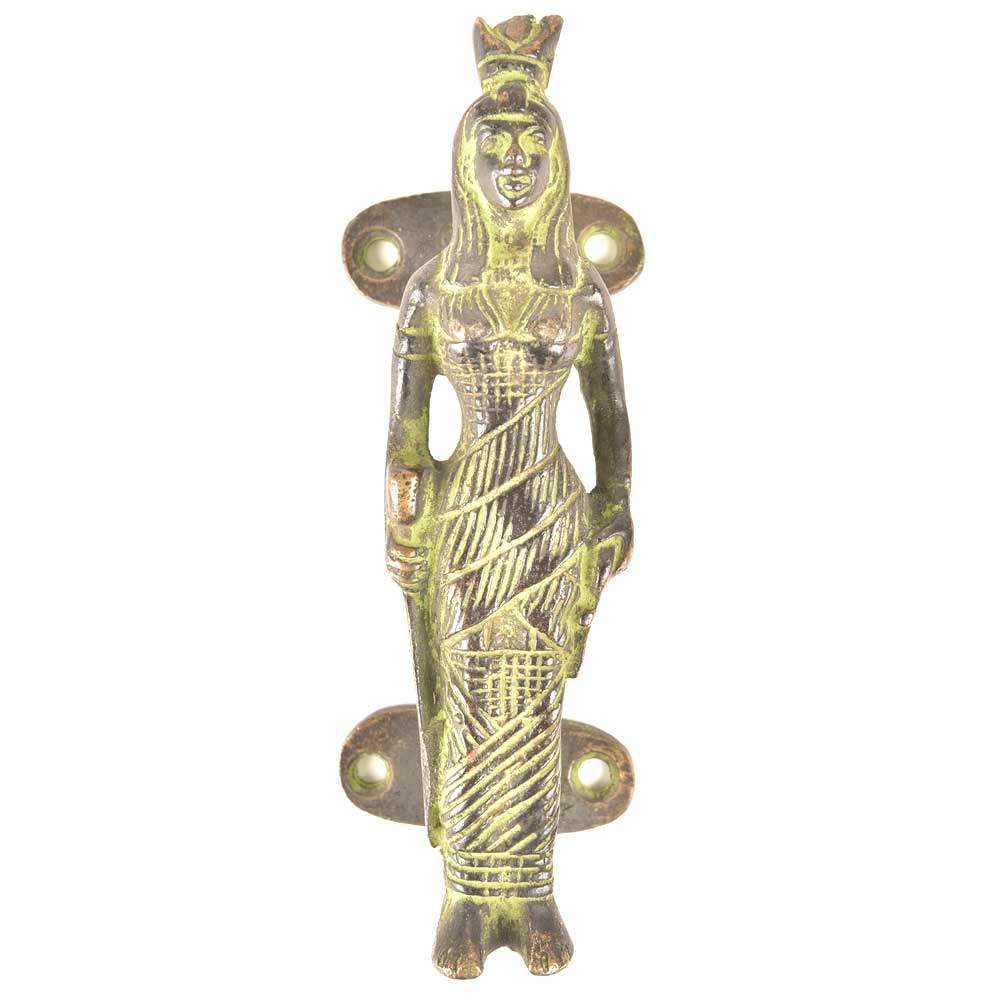 A beautiful figurine of a tribal lady who appears to be the queen or a women of high stature of the tribal community . You can see the details of her dress and a crown on her head and a stick in one of her hand. The figurine has been used as a door handle that can be attached to any door or cabinet.