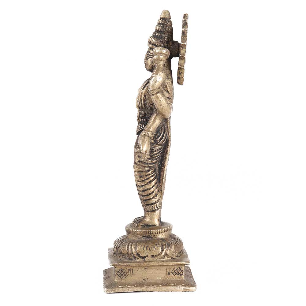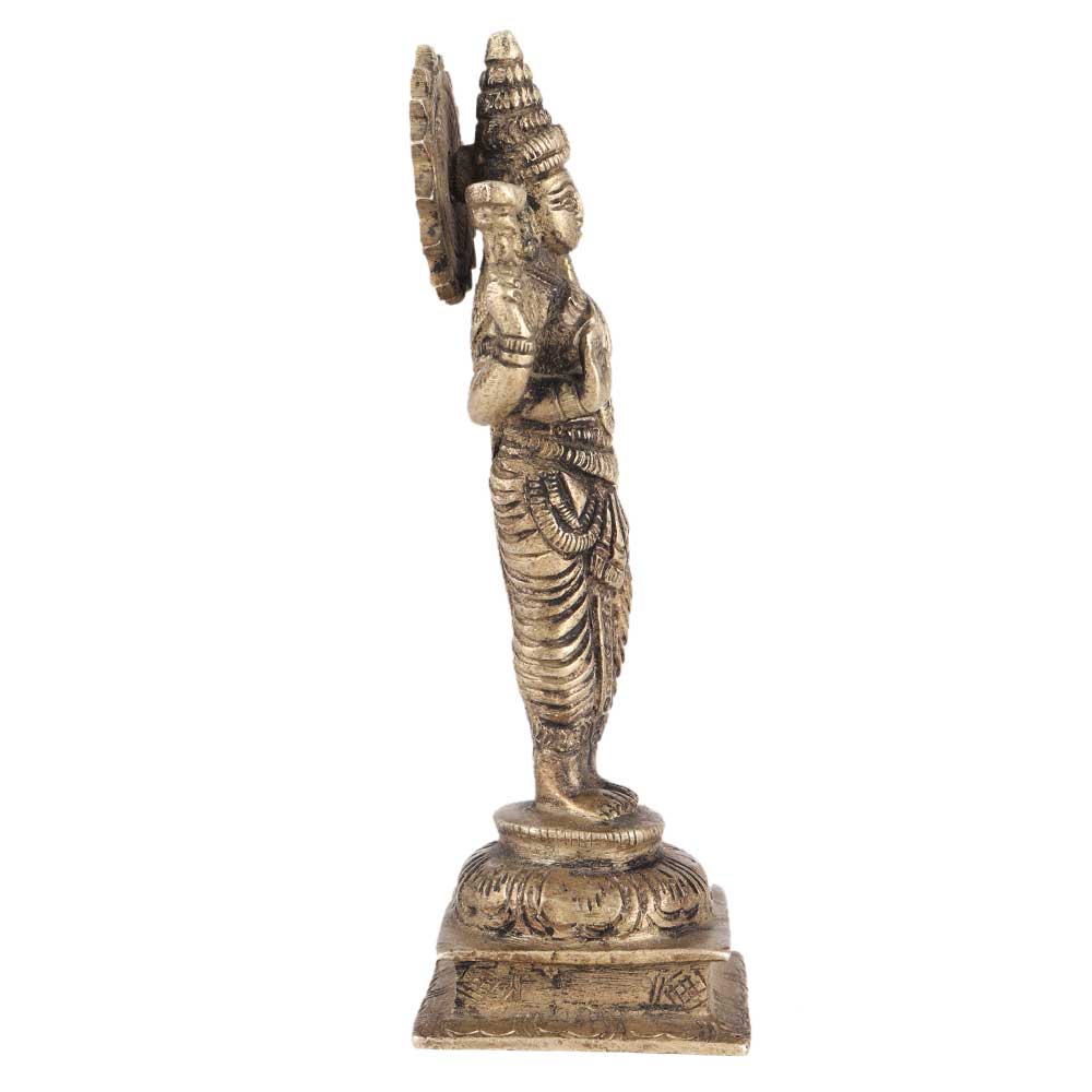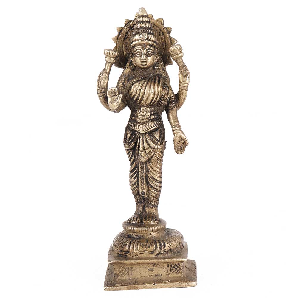 Intricate brass Devi Lakshmi idol depicting Lakshmi standing on a pedestal with four hands holding lotus buds and demonstrating Abhaya Varada mudra denoting prosperity and security. The engravings are intricate, with textile patterns, jewellery, a crown, and other distinct details of devi. This brass Lakshmi idol can be used for everyday puja. Worshiping with this brass statue of Lakshmi may bring us enormous blessings and material fortune to help us overcome our poverty and problems.