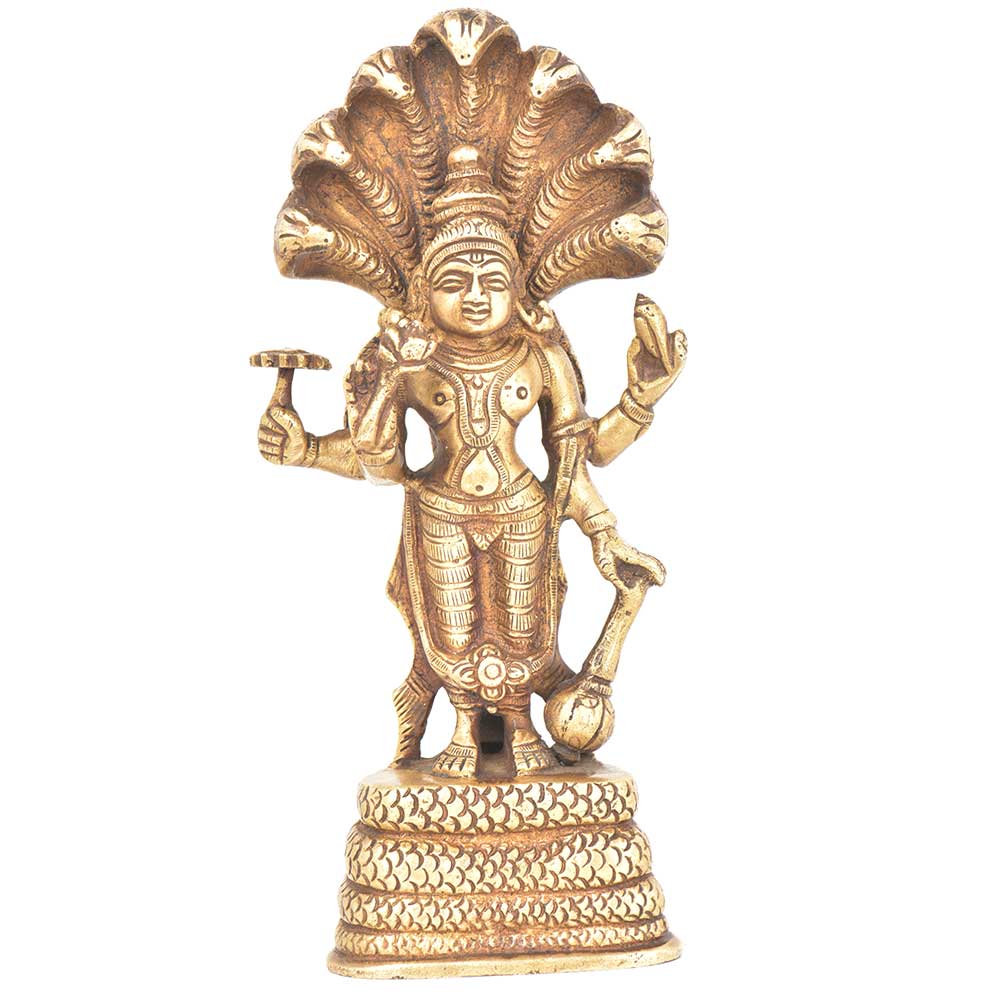 Handmade figurine of vishnu standing on sheshnaag is made of brass by the skilled craftsmen of India. This figurine of vishnu has fine engravings which looks fantastic and it can be used for worshipping, gifting etc.