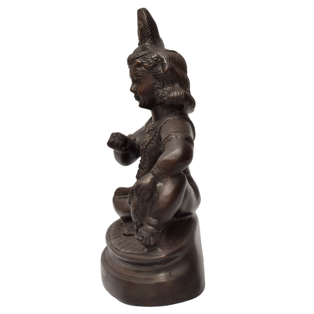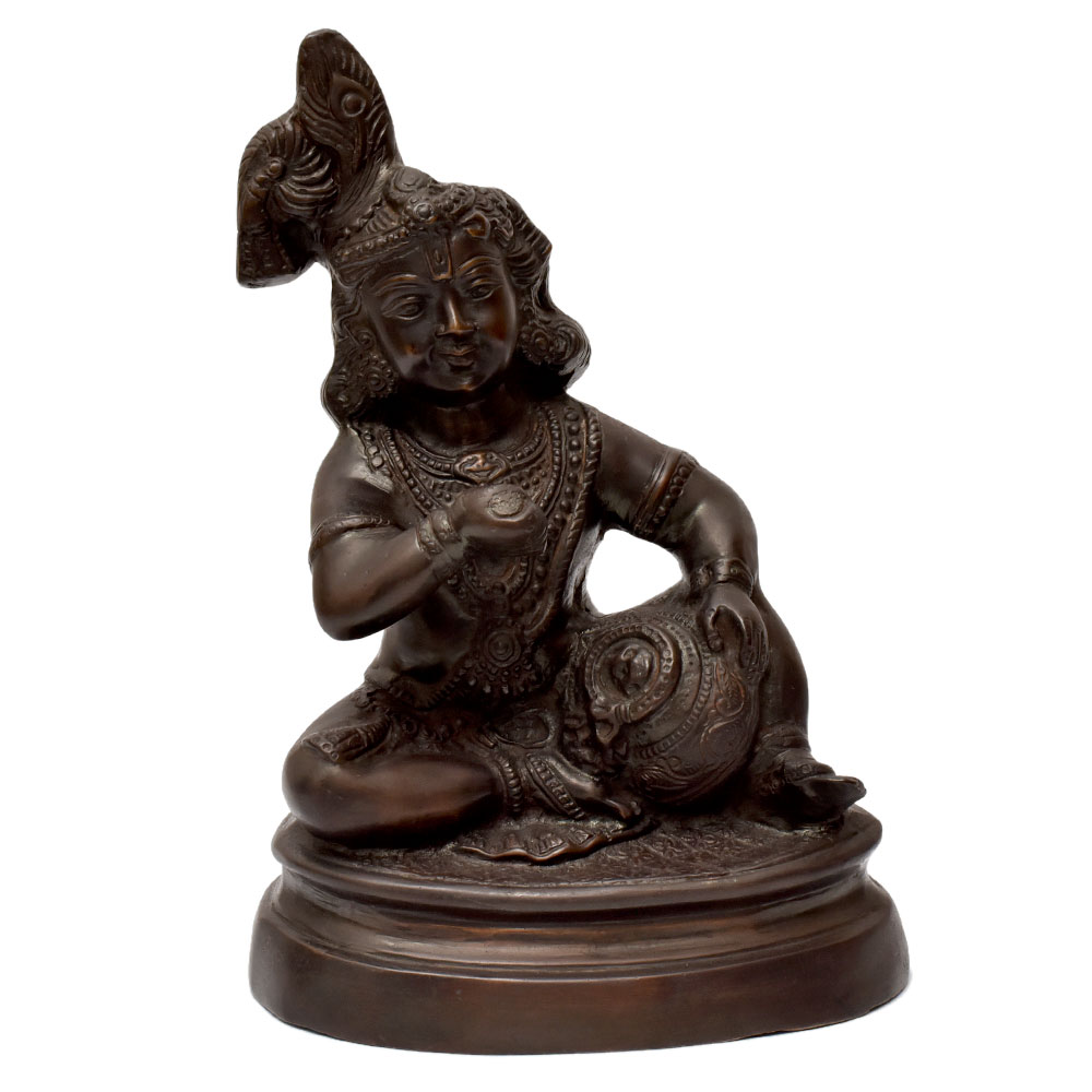 A lovely brass statue of Krishna, the Divine Cowherder, as a child holding a pot of butterballs. Bala Krishna, or baby Krishna, is his affectionate name. Use it for home, temple and office decoration and also as a gift for your near and dear ones.
