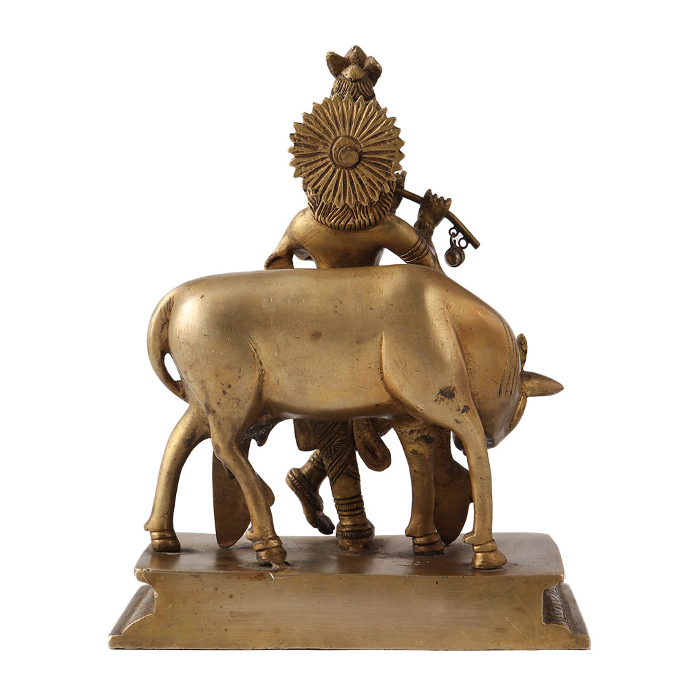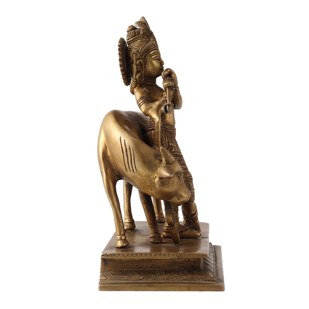 This handcrafted statue of the Hindu god Krishna was created by Indian artisans, making it a wholly genuine object. Krishna is depicted in a lovely, intricate brass figure, holding a cow and a flute. The most revered and adored deity is Lord Krishna. He is created by skilled artisans in India and stands on a lotus base. Use it as a focal point in your home's décor, a gift for Diwali, a wedding, a birthday, or a housewarming. Give this serene work of art to a loved one before they start a new stage of their lives or place it in your living room for an effervescent beauty. It stands for the authority of the Supreme Being, who removes barriers and guarantees that human undertakings are successful.