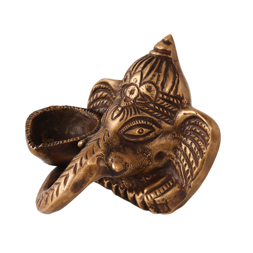 The Brass Ganesha Face with a diya on one side of the face is a unique and eye-catching statue of Lord Ganesha, a popular Hindu deity. The statue is made of brass and features the face of Lord Ganesha with a diya (oil lamp) on one side of his face. The diya is a symbol of light, knowledge, and purity, and is often used in Hindu rituals and ceremonies. The brass statue is often used as a decorative item in homes and temples, and is believed to bring prosperity, happiness, and good fortune. It is also considered a symbol of devotion and reverence towards Lord Ganesha. Buy brass statue for home decoration or gift it to your family and friends