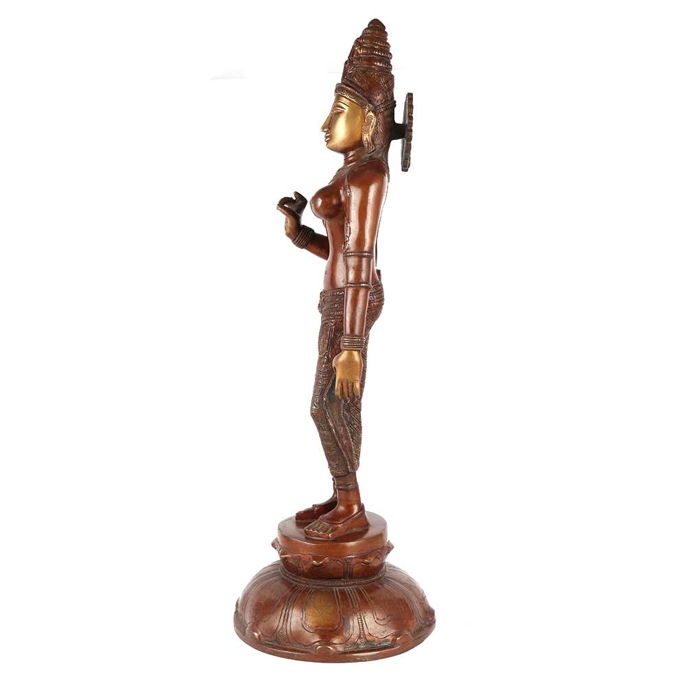 This goddess statue shows goddess Parvati as tall and slender with broad womanly hips, long slender legs and arms. Lord Shiva as Nataraja usually has Parvati as Shivakami standing alongside him as he performs his dance of creation and destruction. Her hat has a conical form which is typical of South Indian fashion.