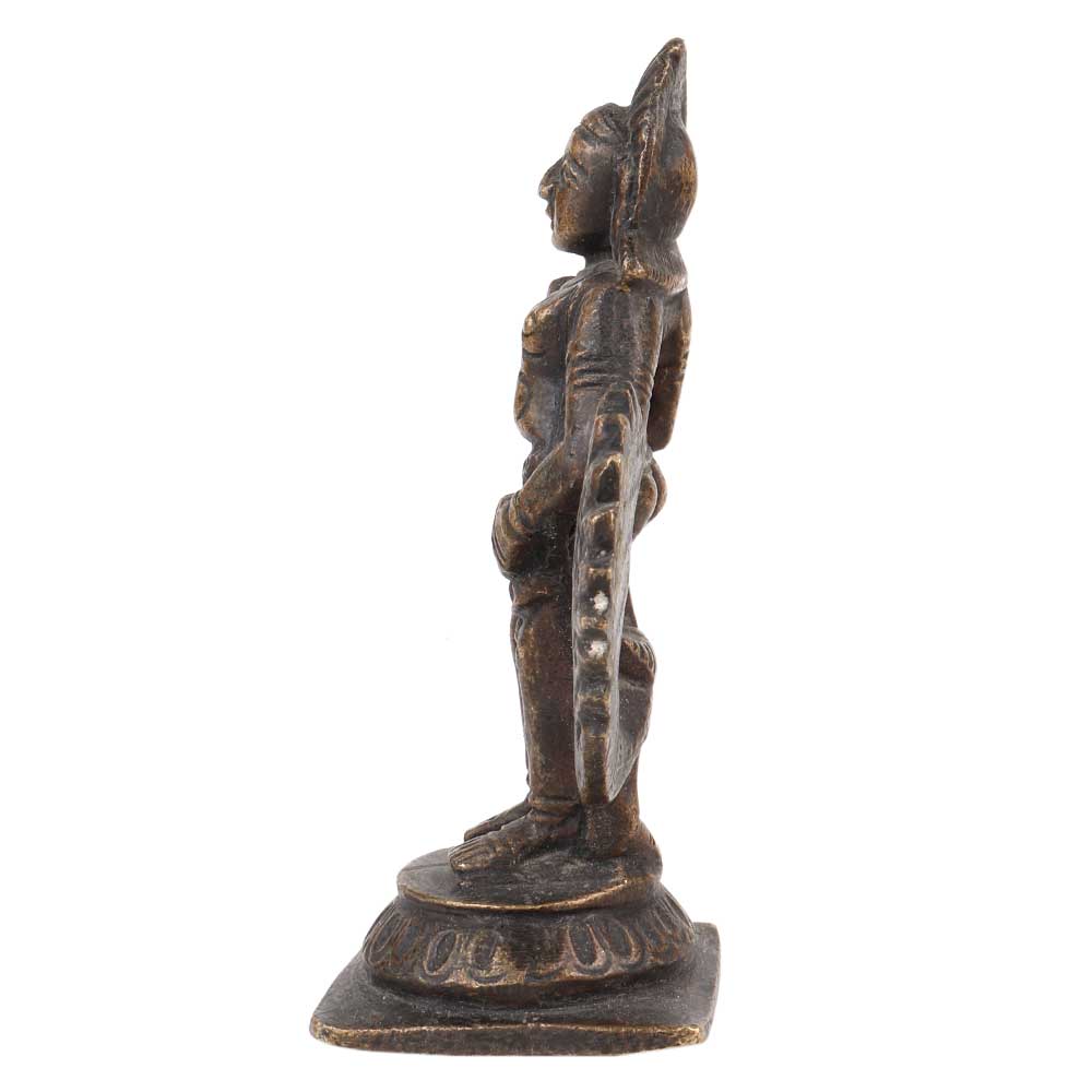 This brass statue of a Kartikeya is meant for decorating your home in Hindu way. He is the commander-in-chief of the army of the devas (gods) and the son of Shiva and Parvati.Murugan is often referred to as "Tamil Kadavul" (meaning "God of Tamils") and is worshiped primarily in areas with Tamil influences, especially South India, Sri Lanka etc.