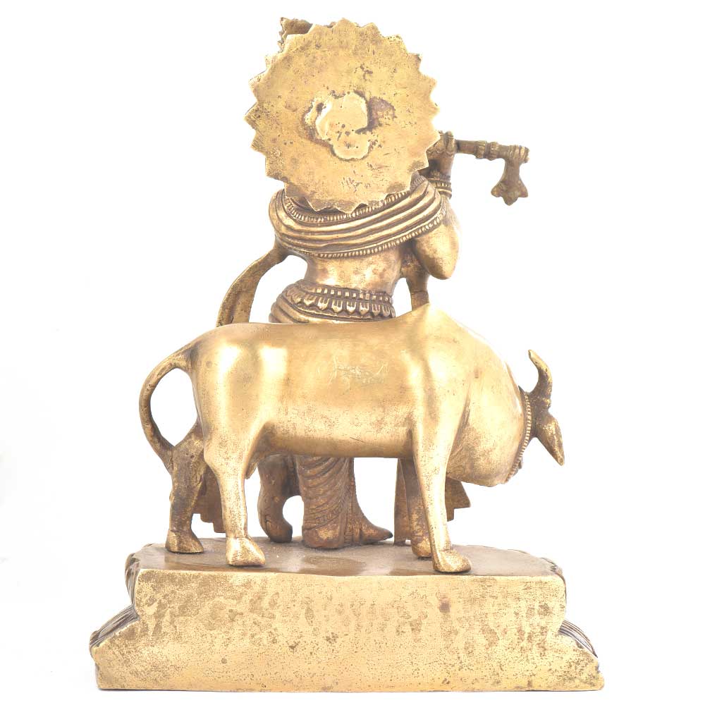 Brass Statue Of Lord Krishna Playing Flute With Cow