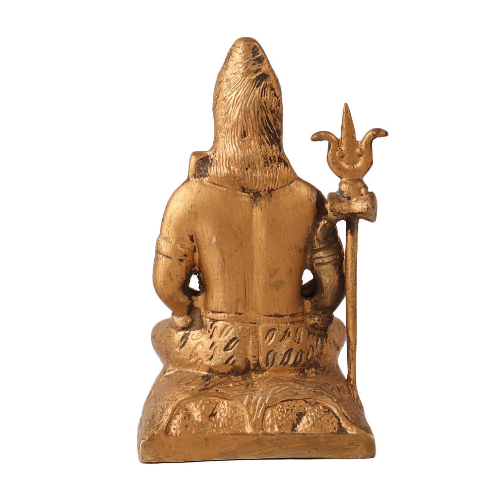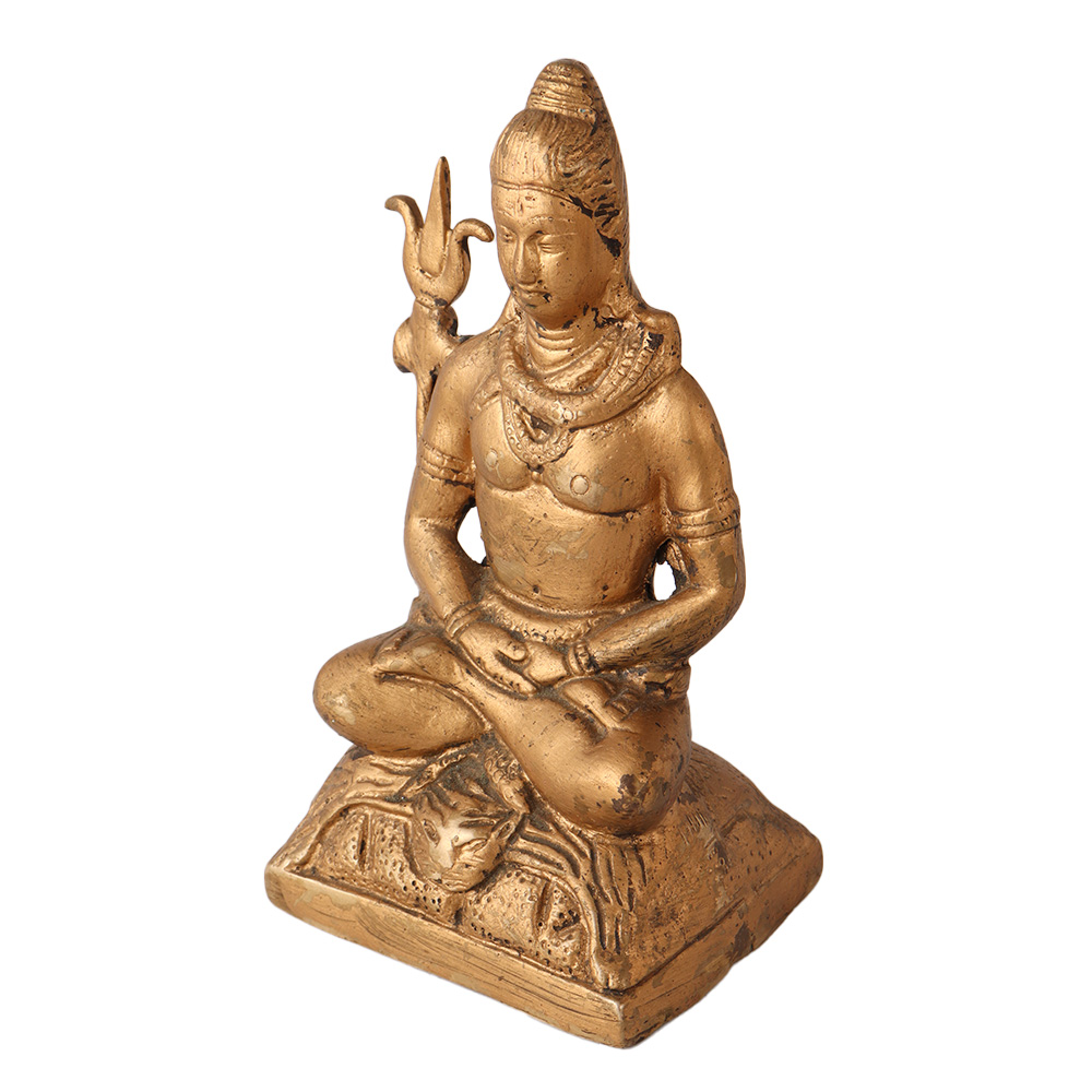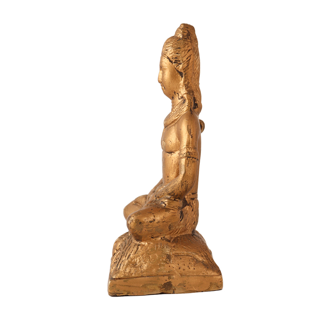 A brass statue depicts a figure seated in meditation on a tiger skin. The holy family statue is holding a trishul, a trident commonly associated with the Hindu god Shiva. The intricate details of the brass statue showcase the skill and craftsmanship of the artist. The tiger skin adds to the aura of power and strength, symbolizing that the meditating figure is someone to be reckoned with. The trishul, with its three prongs, represents the power to destroy, create, and maintain the universe. The famous statue as a whole creates a powerful image of inner peace and immense strength, and is a beautiful representation of Hindu mythology.