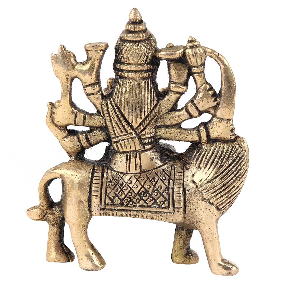 Durga Maa figurine is sitting on the tiger and this figurine is made very beautifully. This figurine is made of brass and is handmade by the skilled craftsmen of India. This durga maa figurine has 8 hands holding weapons in her hands.