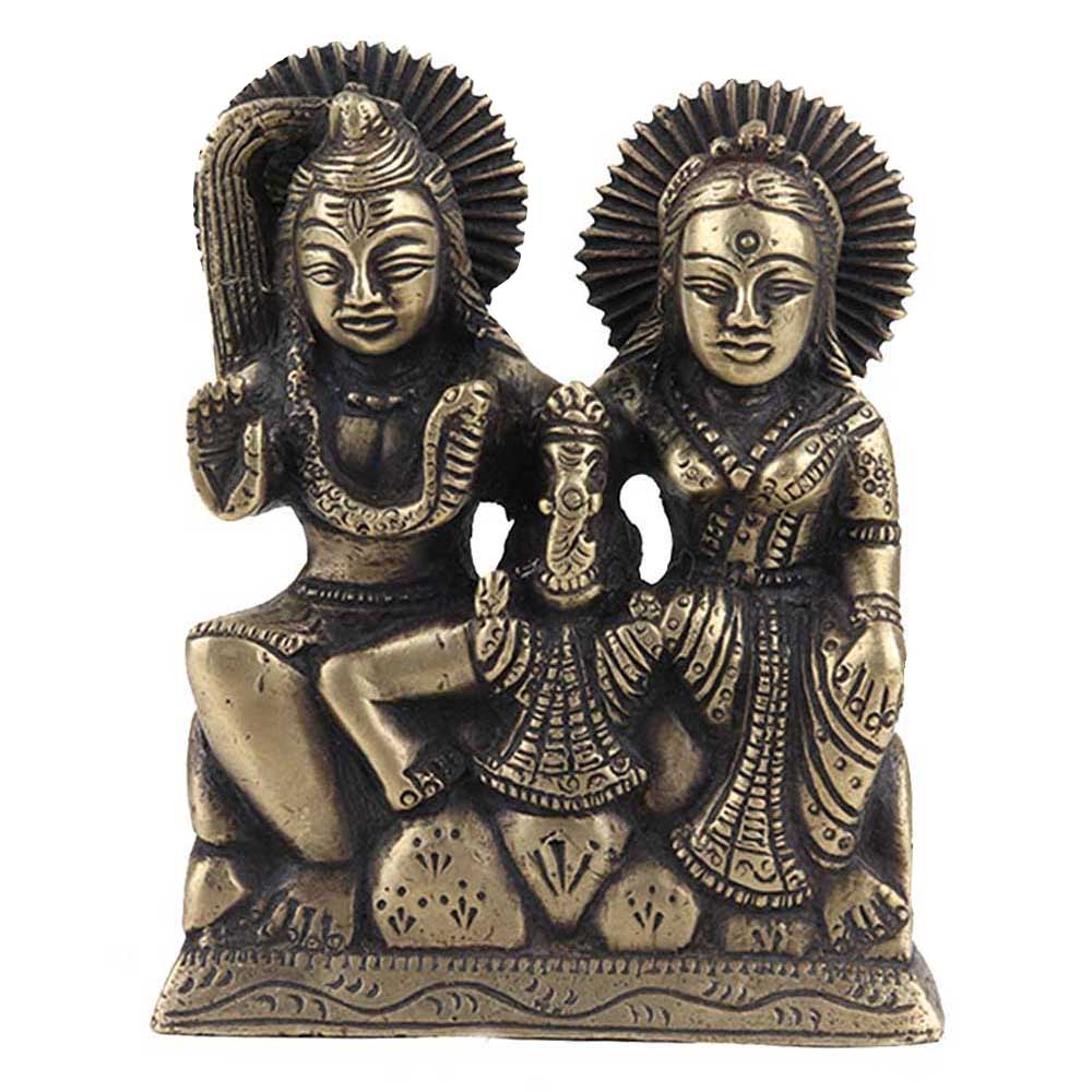 Brass statue of Shiv,parvati and Ganesha sitting on a raised platform dressed in traditional attire with lord Ganesha sitting on their lap is an example of a perfect family . Place it in your pooja room for good luck , use it as a showpiece and gift for your near and dear ones on Diwali, New year, House warming or birthday.